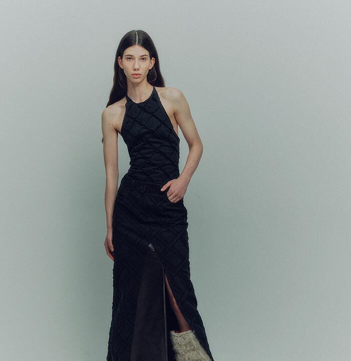 The collection refers to the various surfaces of the earth — the soil, the field as seen from a bird view, and the volcanic desert. The designer tries to recreate them in the collection with various materials, using distinctive trimming methods, such as quilting, distressing, and stitching with elastic threads. These methods help the designer to make each garment more tactile and interactive in terms of the wearer’s senses.