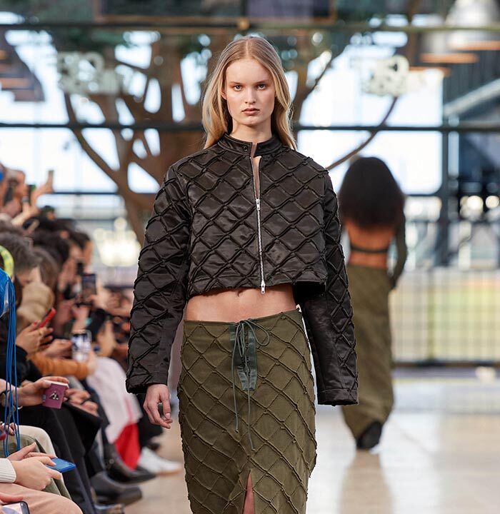 The collection refers to the various surfaces of the earth — the soil, the field as seen from a bird view, and the volcanic desert. The designer tries to recreate them in the collection with various materials, using distinctive trimming methods, such as quilting, distressing, and stitching with elastic threads. These methods help the designer to make each garment more tactile and interactive in terms of the wearer’s senses.