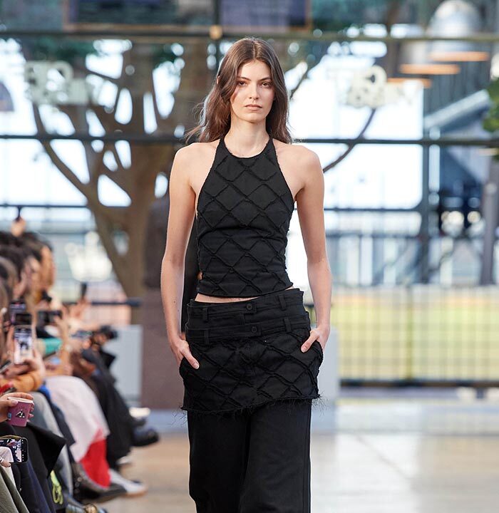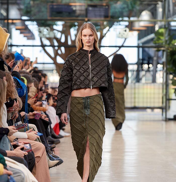 The collection consists of easy-to-wear separates, textured knits, bustier dresses, and more. The color palette is neutral with an emphasis on earthy hues — khaki, graphite, volcanic gray — and a bright splash of light green.