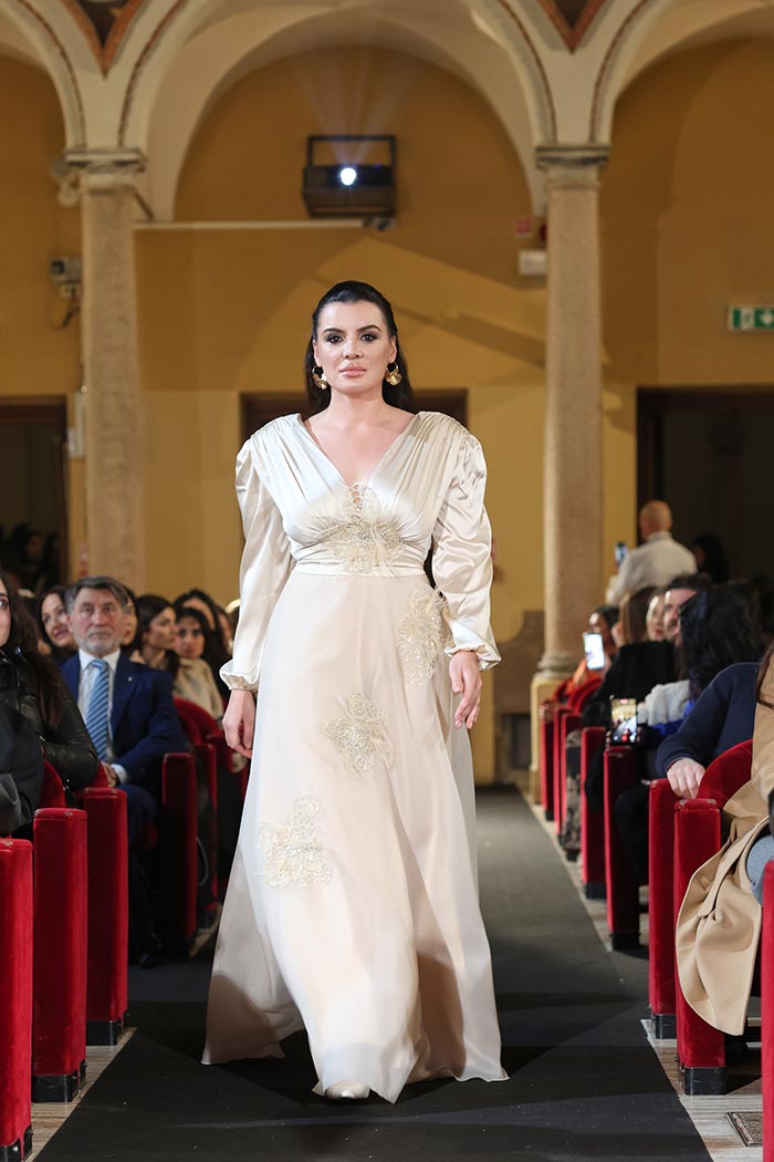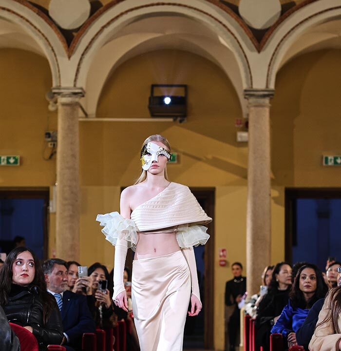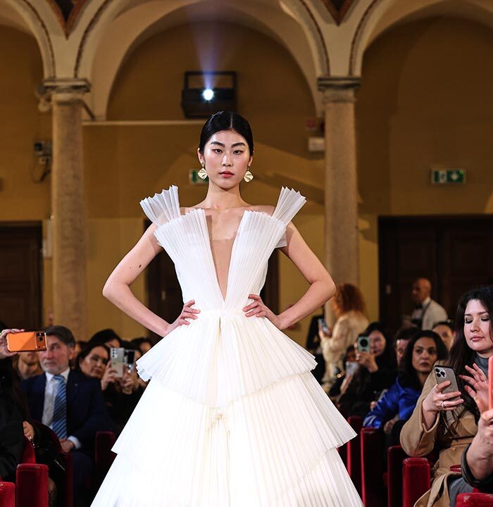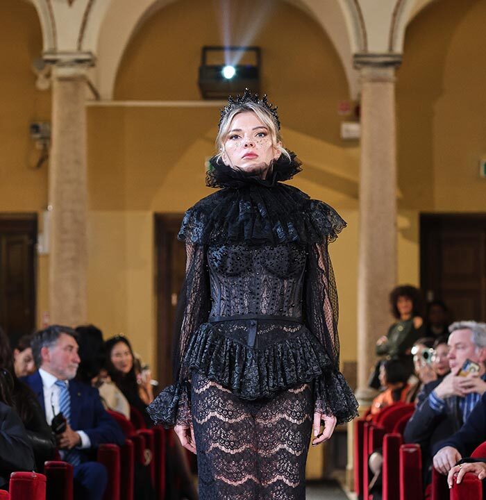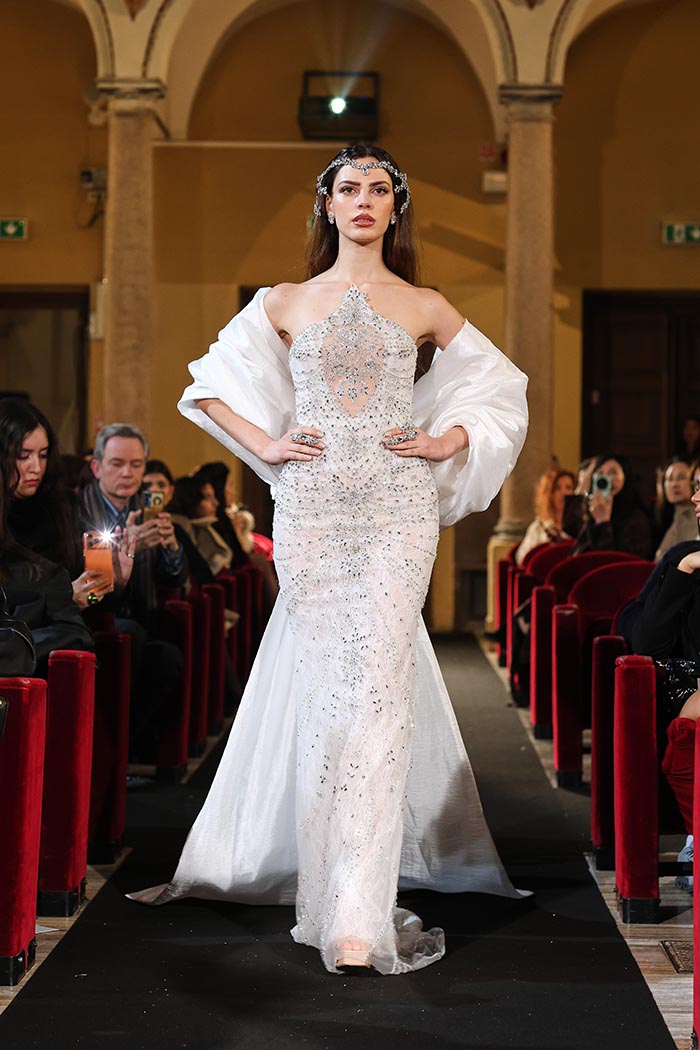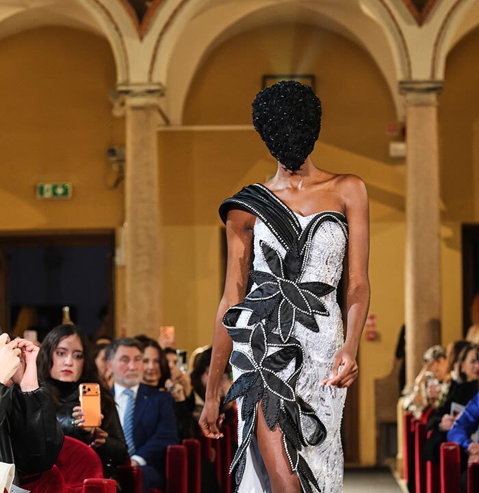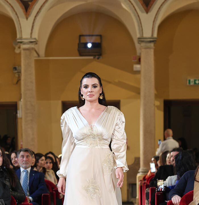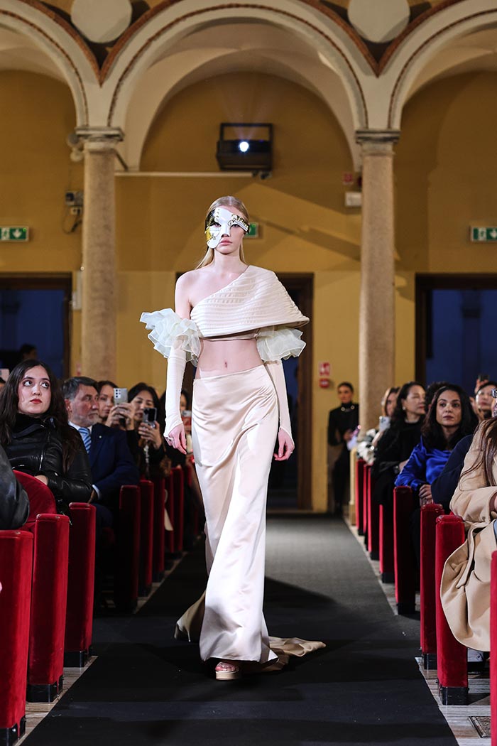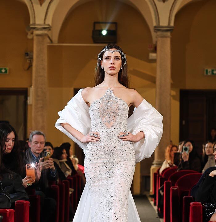 More than a fashion show, the event became a curated experience where identity, craftsmanship, and contemporary vision converged into a global dialogue. Hosted inside the historic Centro Ambrosiano — an architectural complex dating back to 1232 — the event, conceived and directed by Yuliia Palchykova, presented nine international designers within an immersive narrative where haute couture, bridal couture, author jewelry, and conceptual fashion merged into one cohesive artistic statement. Through architectural silhouettes, sculptural tailoring, symbolic detailing, and bold chromatic language, the show articulated fashion as an expression of heritage, transformation, and global consciousness.