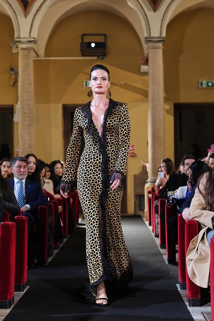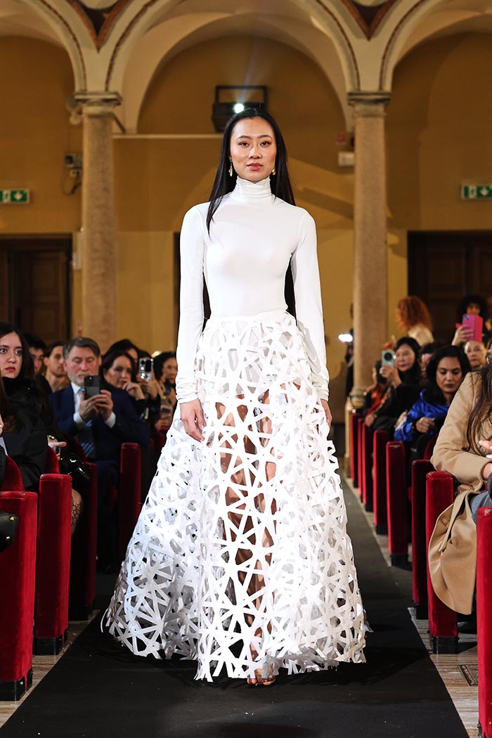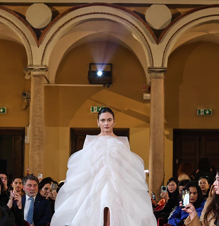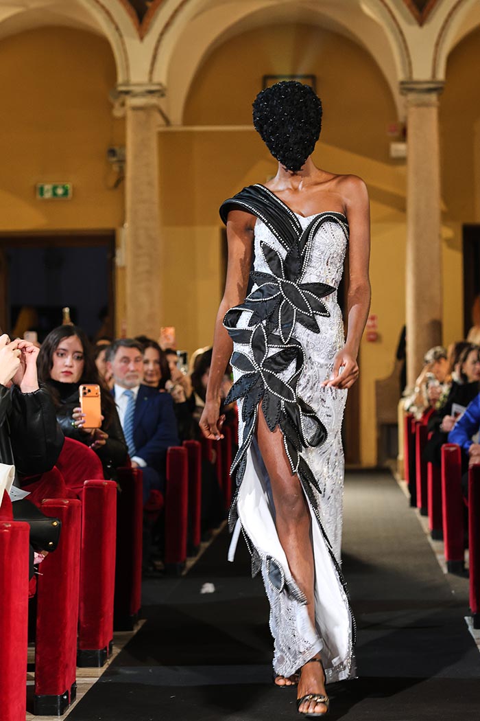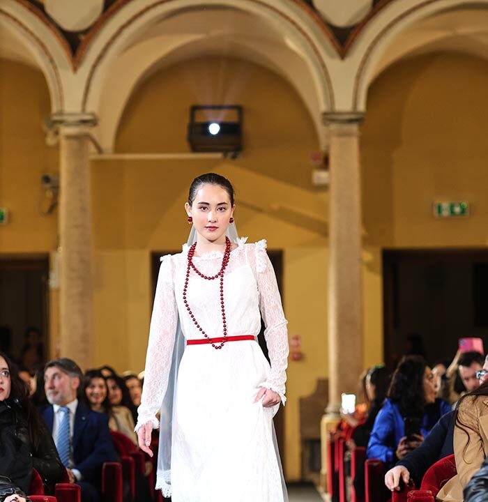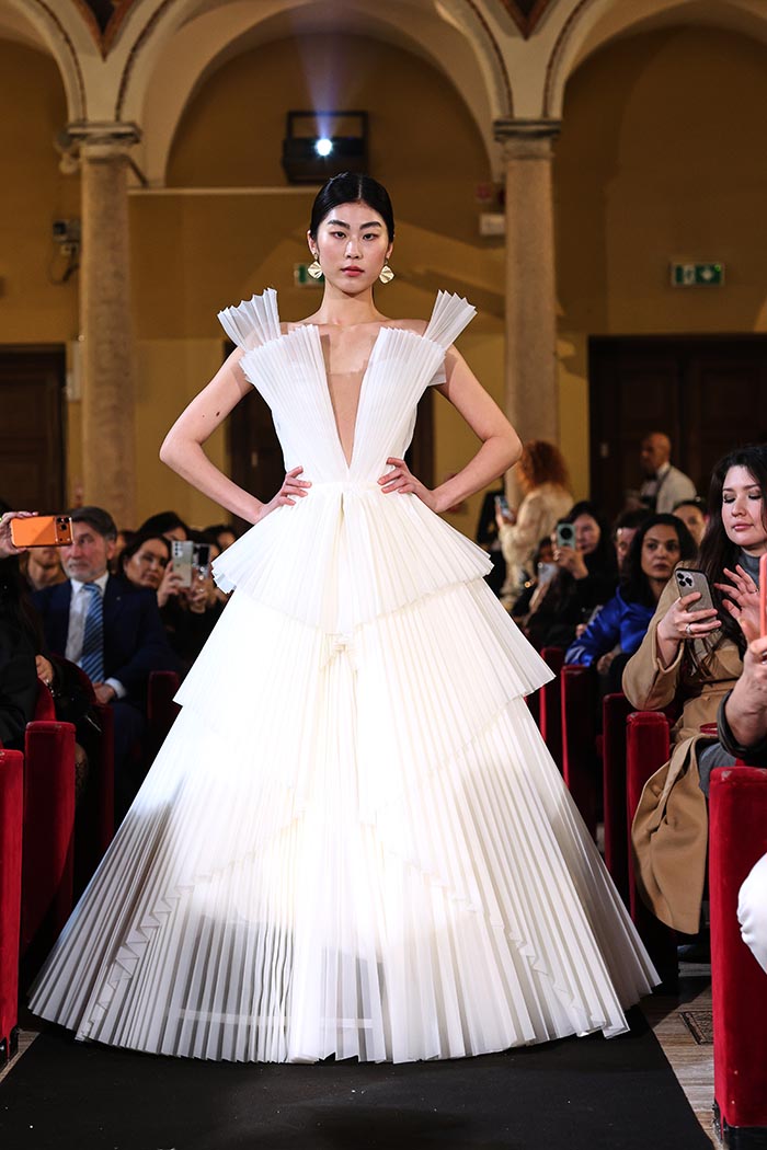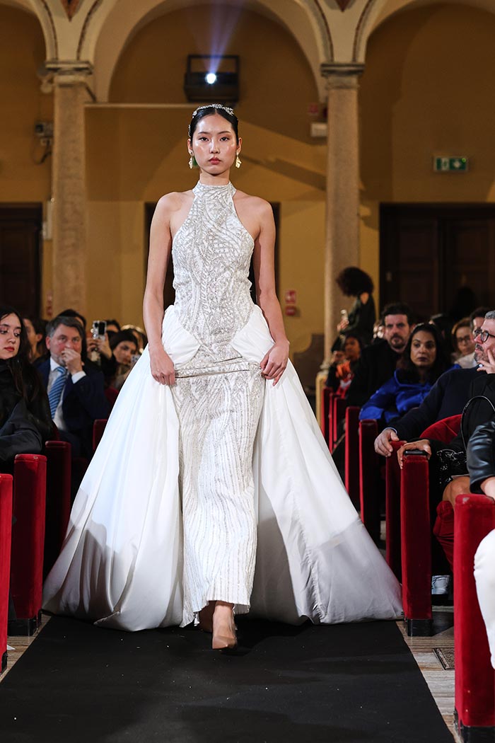 More than a fashion show, the event became a curated experience where identity, craftsmanship, and contemporary vision converged into a global dialogue. Hosted inside the historic Centro Ambrosiano — an architectural complex dating back to 1232 — the event, conceived and directed by Yuliia Palchykova, presented nine international designers within an immersive narrative where haute couture, bridal couture, author jewelry, and conceptual fashion merged into one cohesive artistic statement. Through architectural silhouettes, sculptural tailoring, symbolic detailing, and bold chromatic language, the show articulated fashion as an expression of heritage, transformation, and global consciousness.