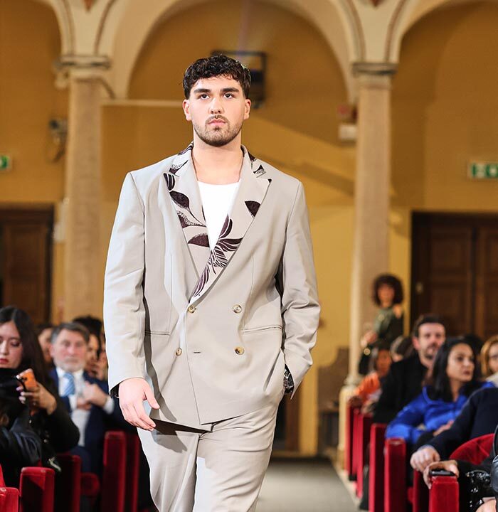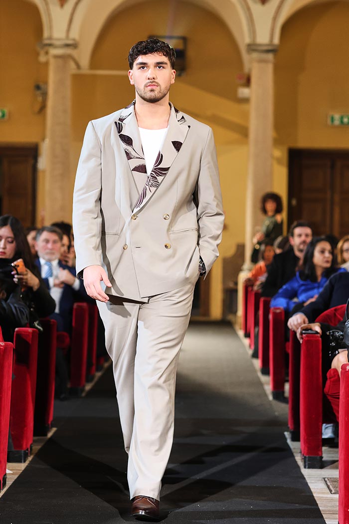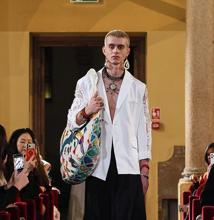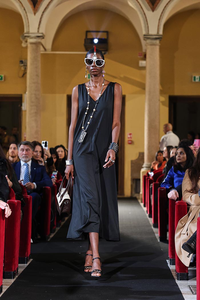 In the millenary courtyard of Centro Ambrosiano, the Showroom Experience extended the runway narrative into a curated environment designed for dialogue between designers, buyers, and international press. Among the featured brands, GUROZI (Georgia) presented a refined selection of artisanal accessories and bags distinguished by material research and a minimalist yet culturally rooted aesthetic. GUROZI’s creations articulated a contemporary vision of Eastern European design — symbolic, essential, and globally positioned. The interaction between couture garments and crafted accessories created a balanced conversation between structure and object, between garment and icon, offering a complete and immersive fashion ecosystem.