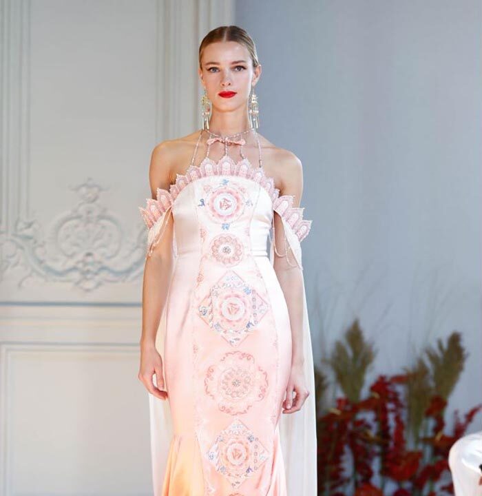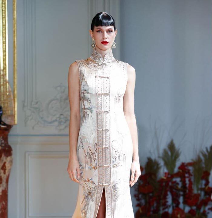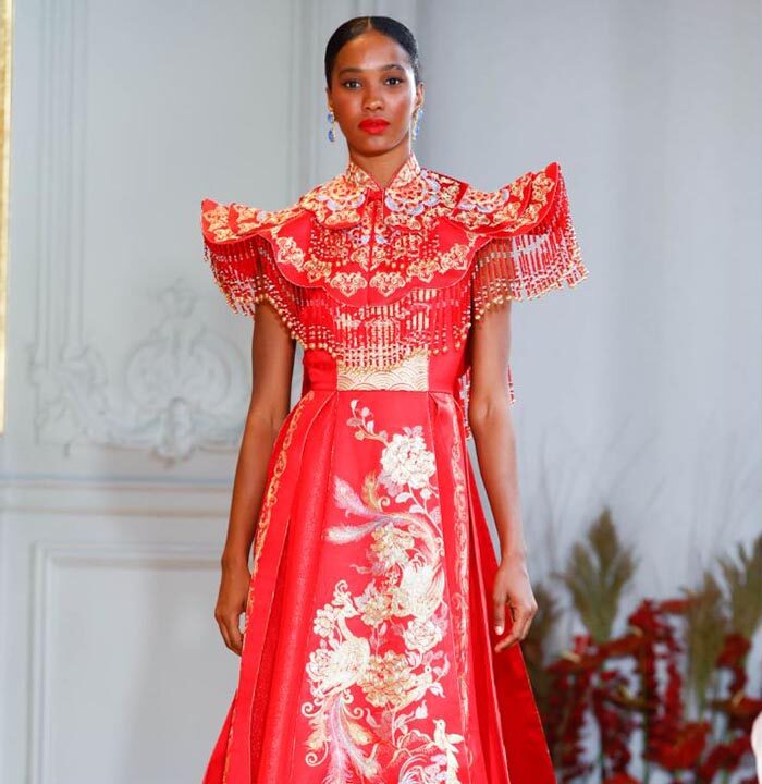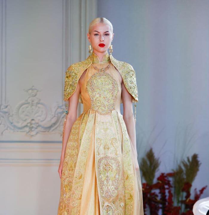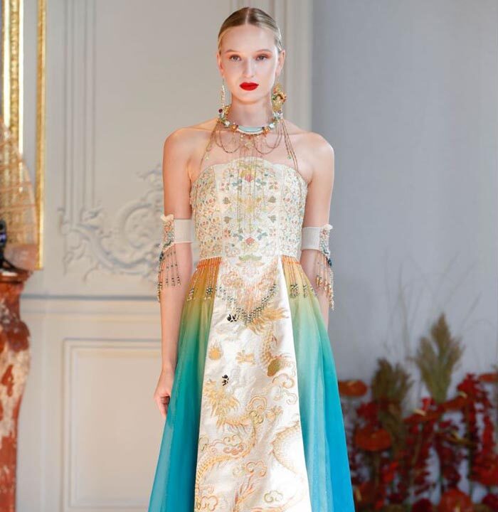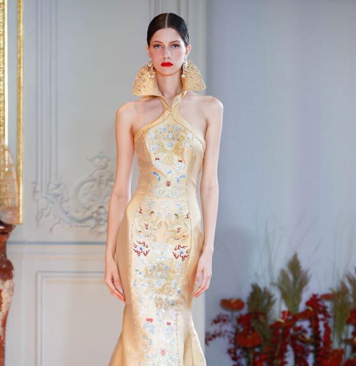 This season, “Liu Li · LOOLAYY,” utilizing Dunhuang elements as a medium, explores the opulent beauty of traditional, new Chinese-style ceremonial attire. While containing the splendorous Chinese scholasticism within Chinese wedding fashion style, it mines the beauty of modern women in the transmission of Chinese scholarly tradition. Chinese millennial intangible cultural heritage crafts like Ping embroidery, coiled gold work, and seed embroidery, applied to clothing design and production, not only maintain the intrinsic texture of the attire but also embody artistic and fashionable aesthetic expression.