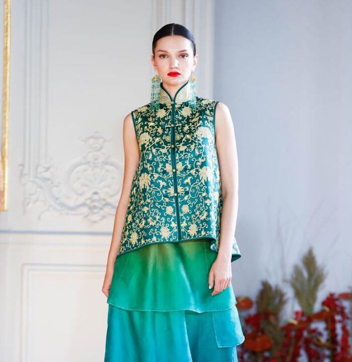Fashion designers extract patterns and color elements from Dunhuang murals, combining them with the warm and fluid silhouette of the patterns, bringing a new season of Chinese elegant aesthetic through the main colors of gold, red, blue, and green. By combining modern craftsmanship with traditional culture, it is hoped that women wearing “Liu Li · LOOLAYY” attire can fully exhibit the charm of Eastern beauties and display their own boundlessly wonderful strength. This series especially introduces sparkling materials such as crystals, pearls, rhinestones, and laser sequins, which are set against glazed and natural mulberry silk fabrics, presenting a vibrantly colorful visual effect. The exquisitely fine embroidery patterns seem to walk out of the long history, infusing the series with a rich artistic atmosphere.