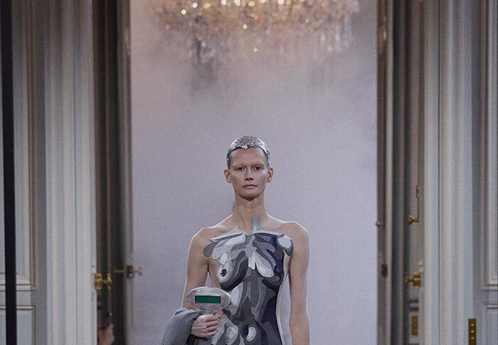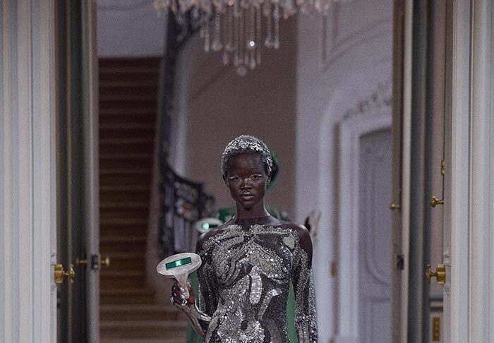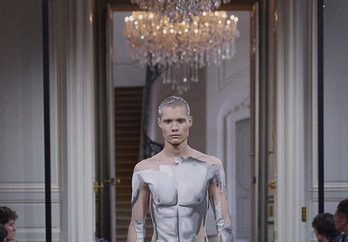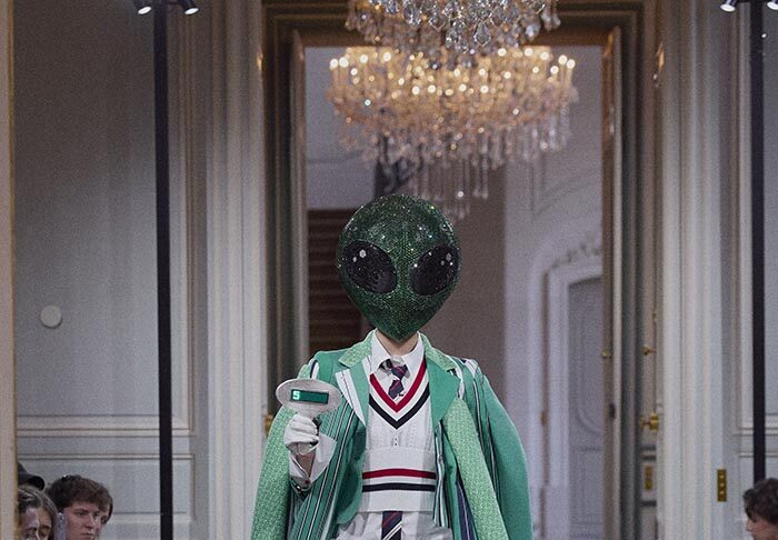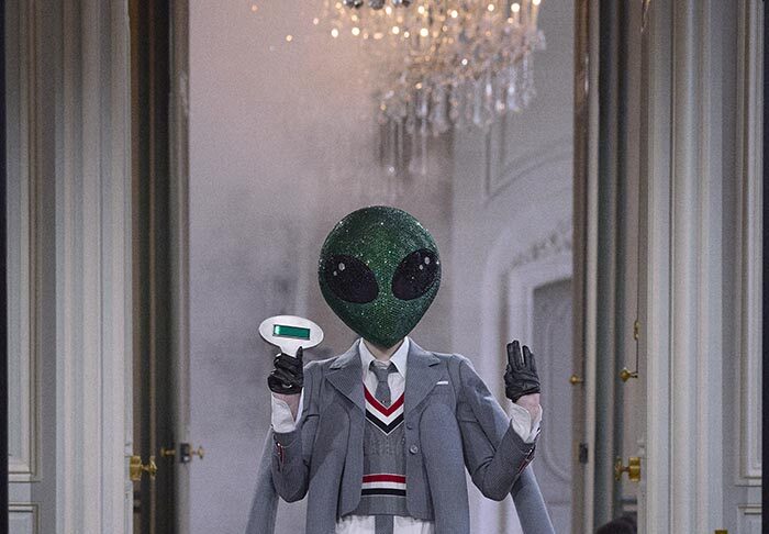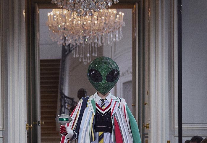 unidentified objects make contact, touching down, drifting into the room. the unearthly visitors glide forth in deconstructed, then reconstructed, humanoid proportions. morphing and evolving, harmony forms in the parallels between the space invaders and extraterrestrials. some wear trousers with four legs, some with two. no two pieces are quite the same, nor quite so different…