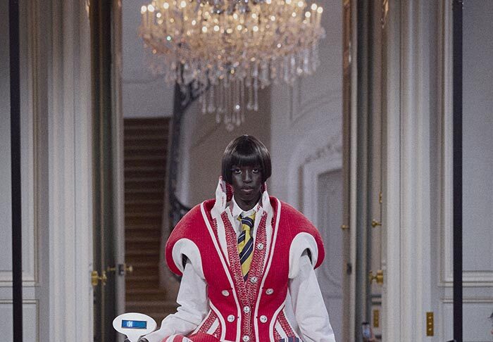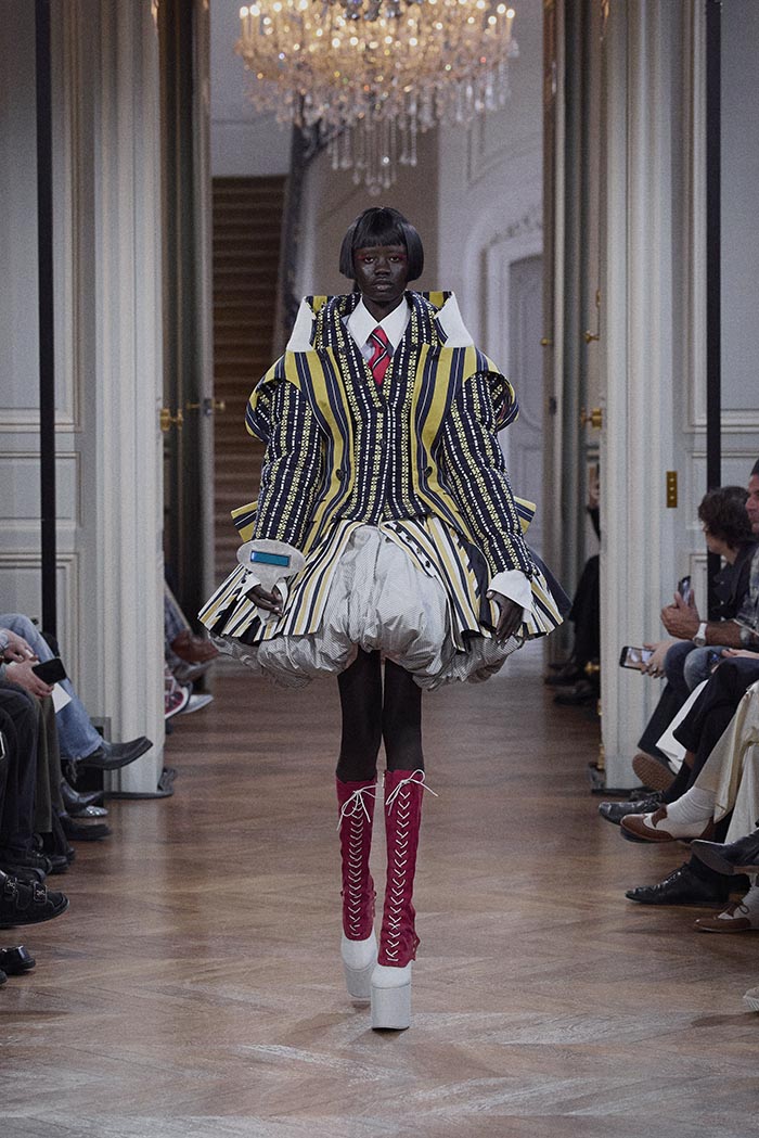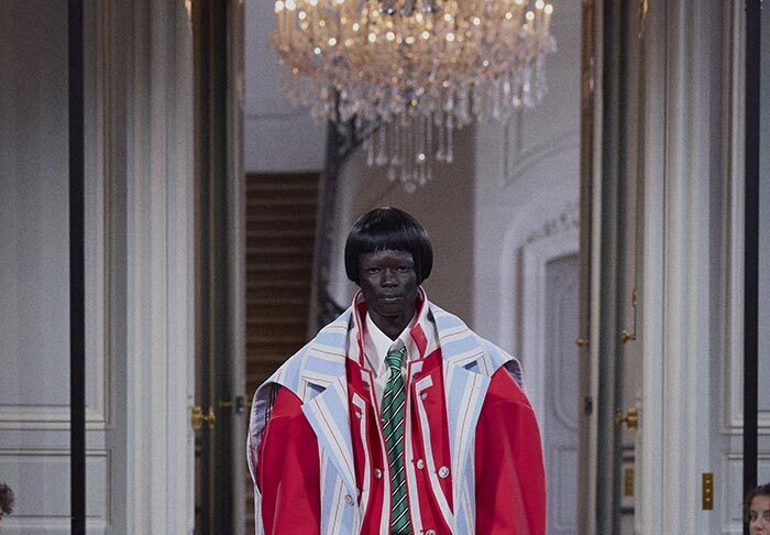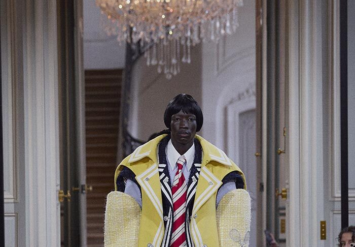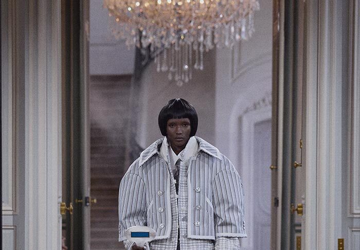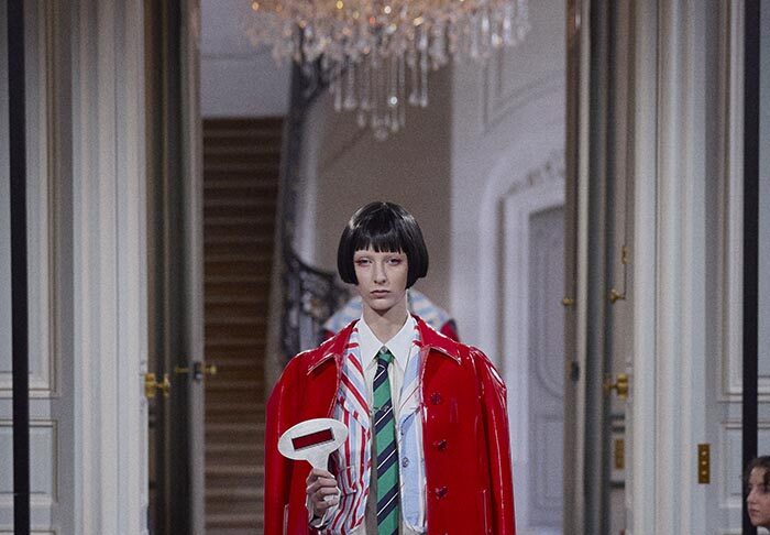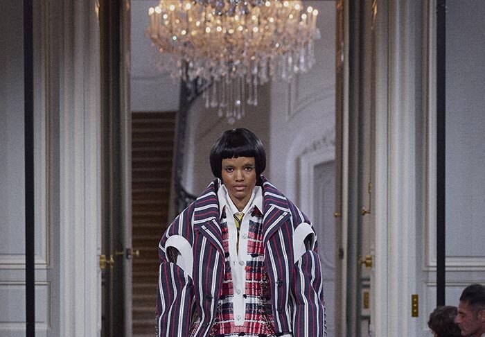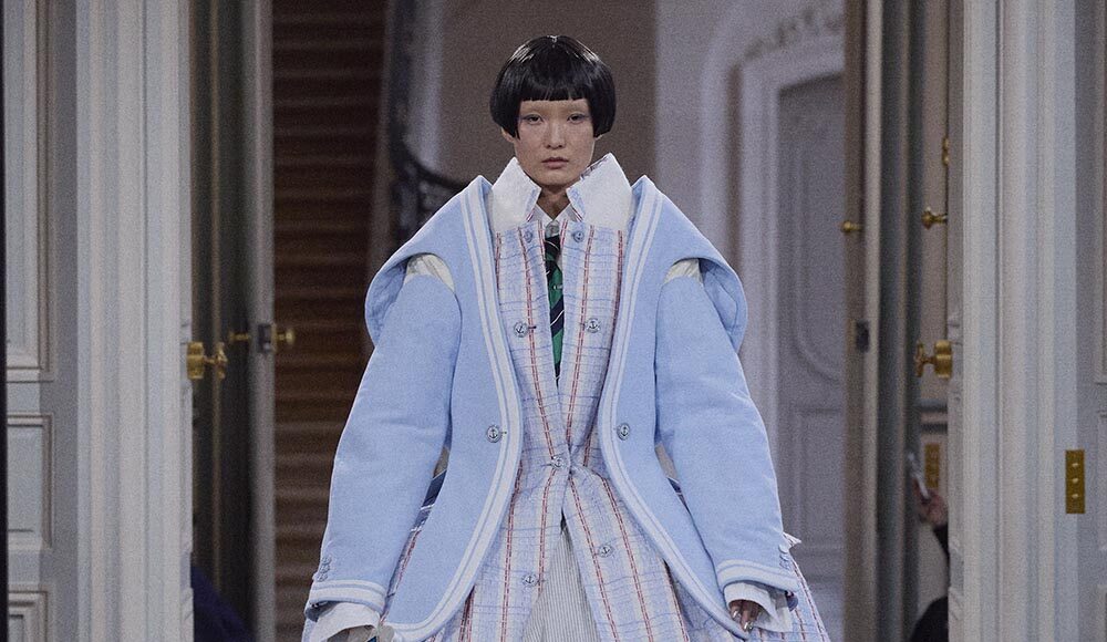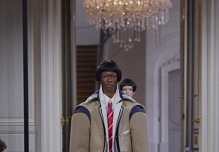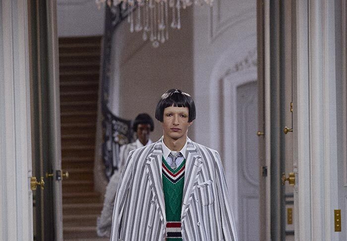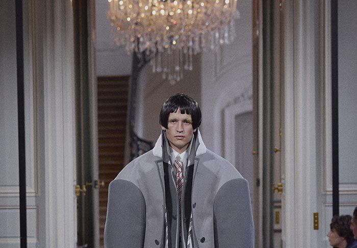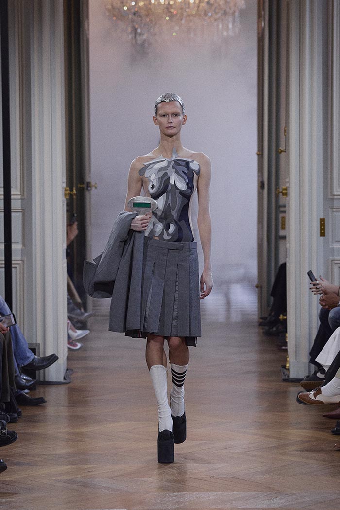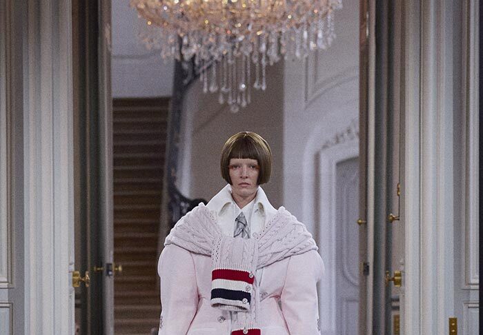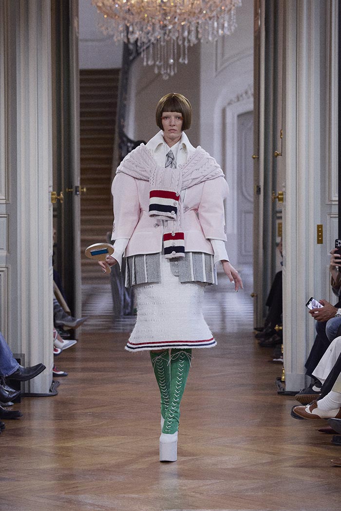 sport coats are cut in an assertive new silhouette, departing from classic lines to reveal shoulders that are twisted forward to resemble raglans – a nod to classic varsity shapes and american sportswear. these strong shoulders are pressed forward, waists are curved in, and hems have a structured flare creating thom’s new look for tailored dressing. skirts are lowered to a drop-waist and belted, pleats unfolding, softly draped just above the knee. the cricket sweater, layered within, a foundational thom browne design, is shrunken and cropped.