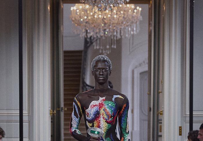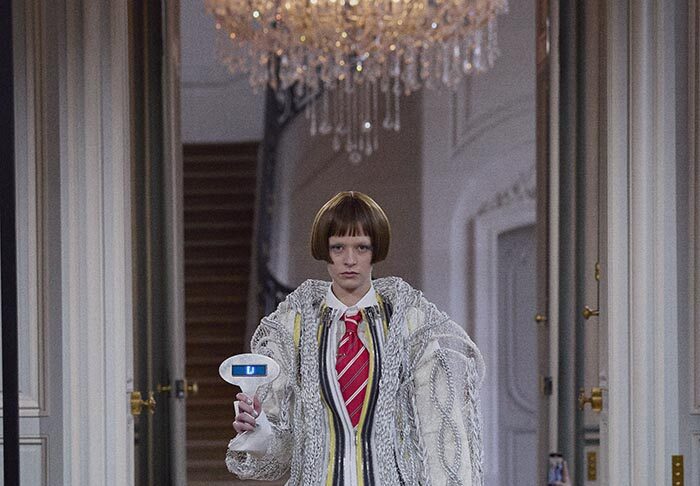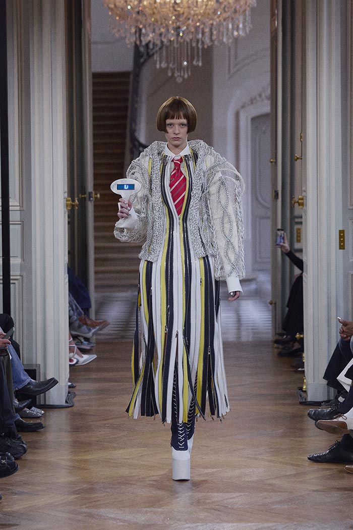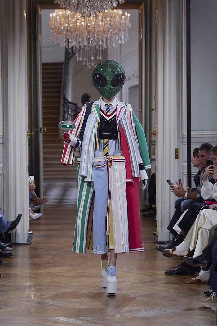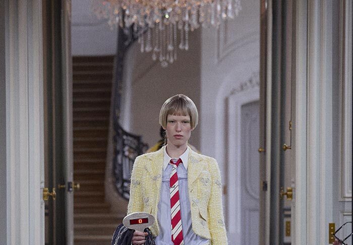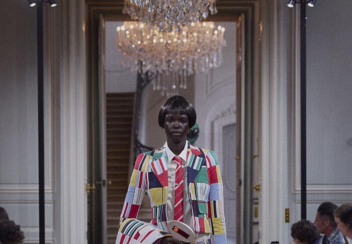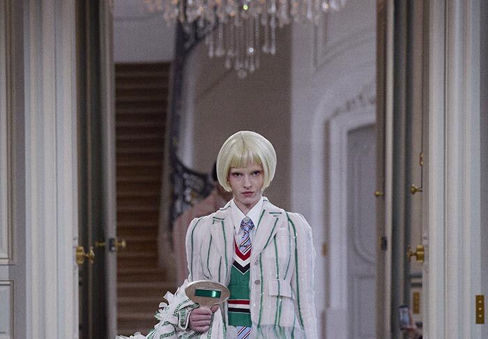 bright preppy palettes elevate chromatic contrasts. repp stripes are woven, embroidered, multiplied, thom’s classic techniques of the past twenty years stretched to their limits. tweeds and seersucker mingle with sterling silver grommets and rings. selvedge patchwork and sequined tulle shimmer like signals across the spectrum of light…