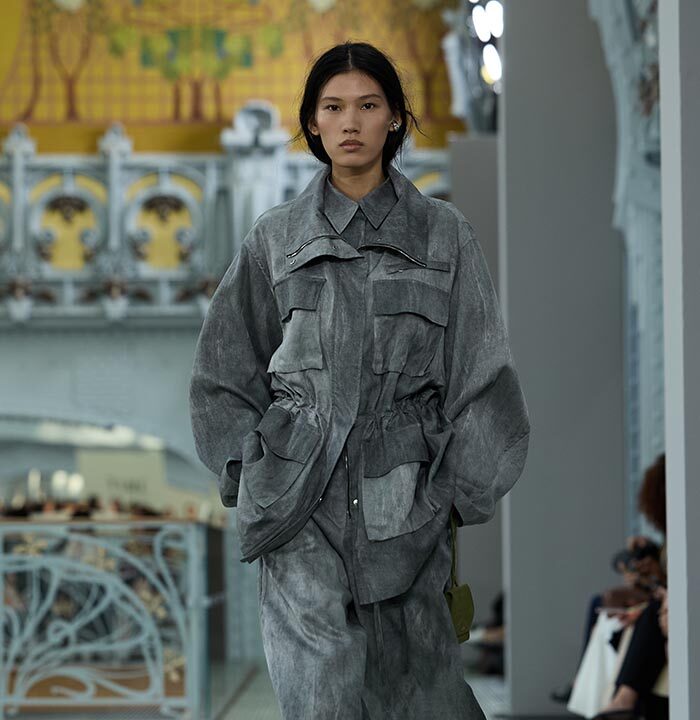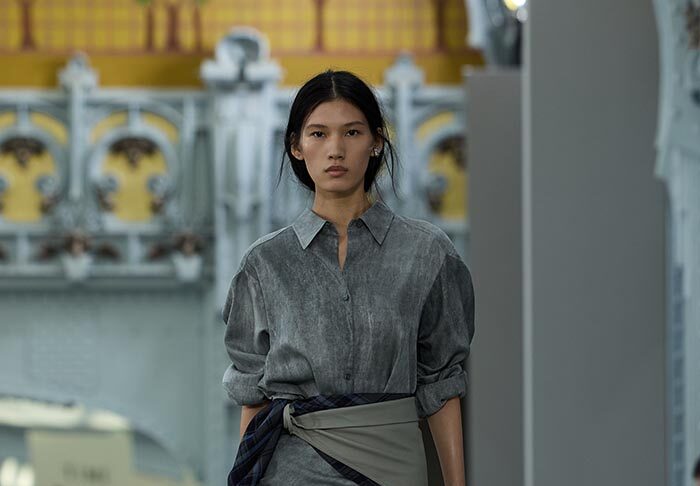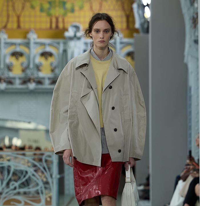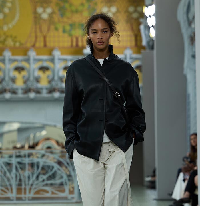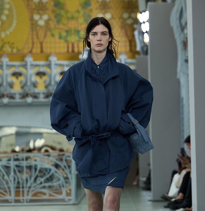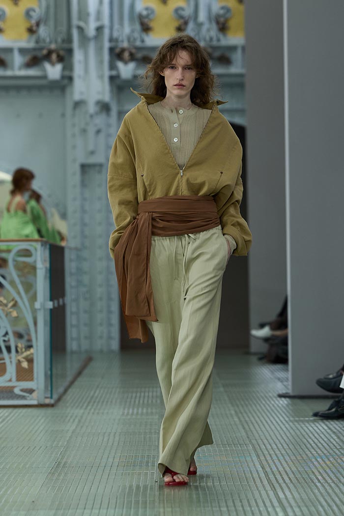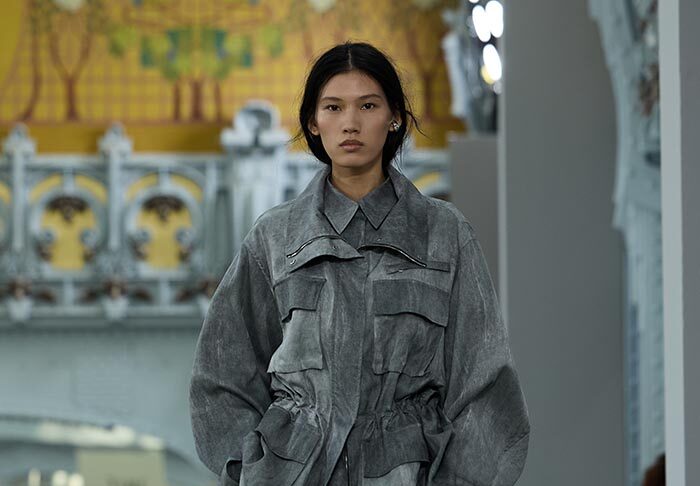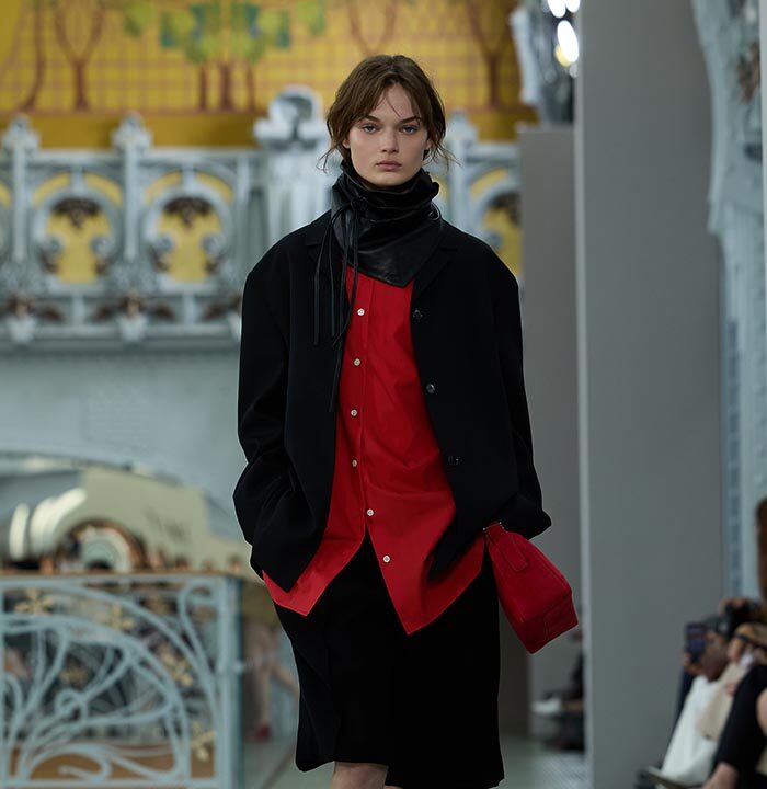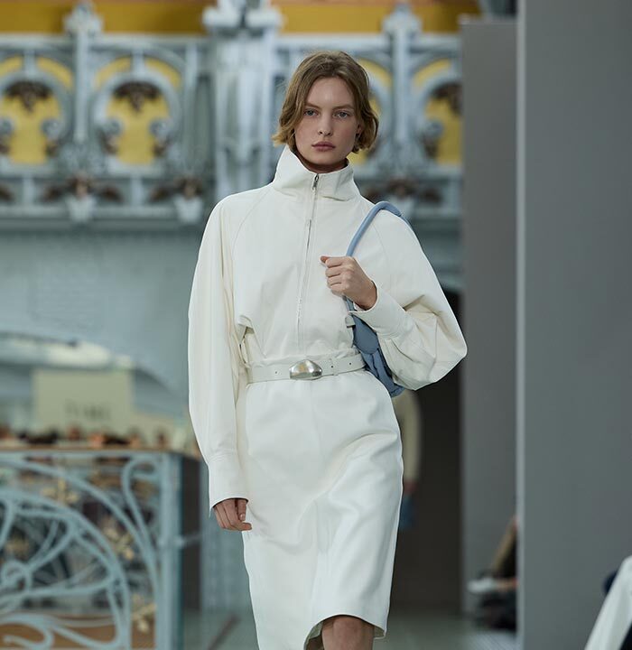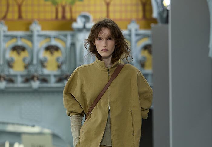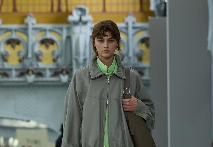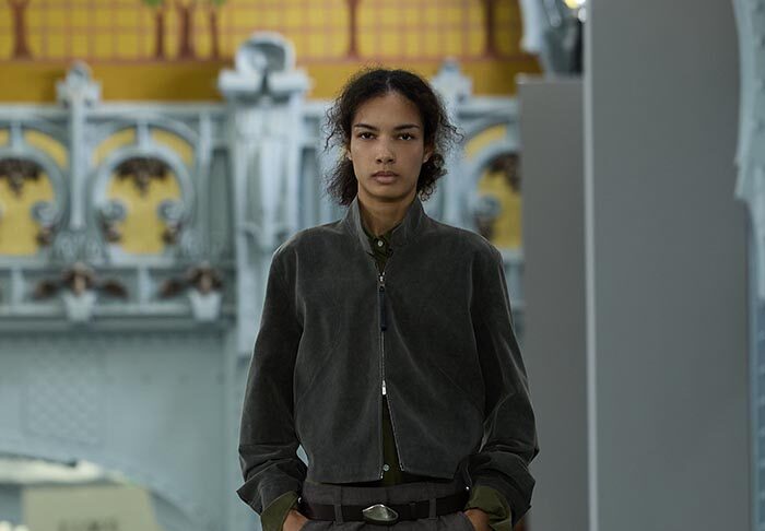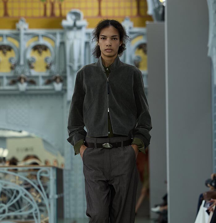 This season, design draws on streetwear, lungewear, and couture to create both harmony and clash,balance and impact. Fluid and supple, the fabrics were chosen to reinforce this play of contrasts while ‘making multiple wearings possible: sft leather, ary silk, washed denim, technical fabric. Likewise, the color palette mixes urban neutrals (light grey, anthracite, off-black, off-white, mustard yellovs) with flashes of cobalt blue, carmine red, faded rose, and lichen green.