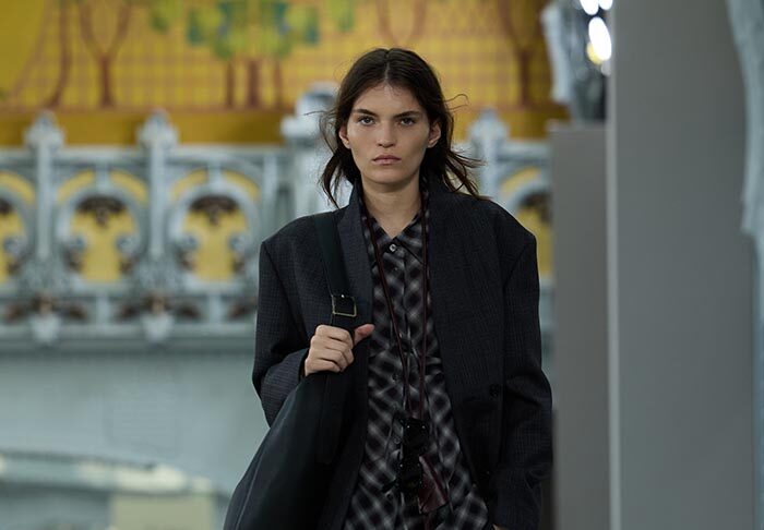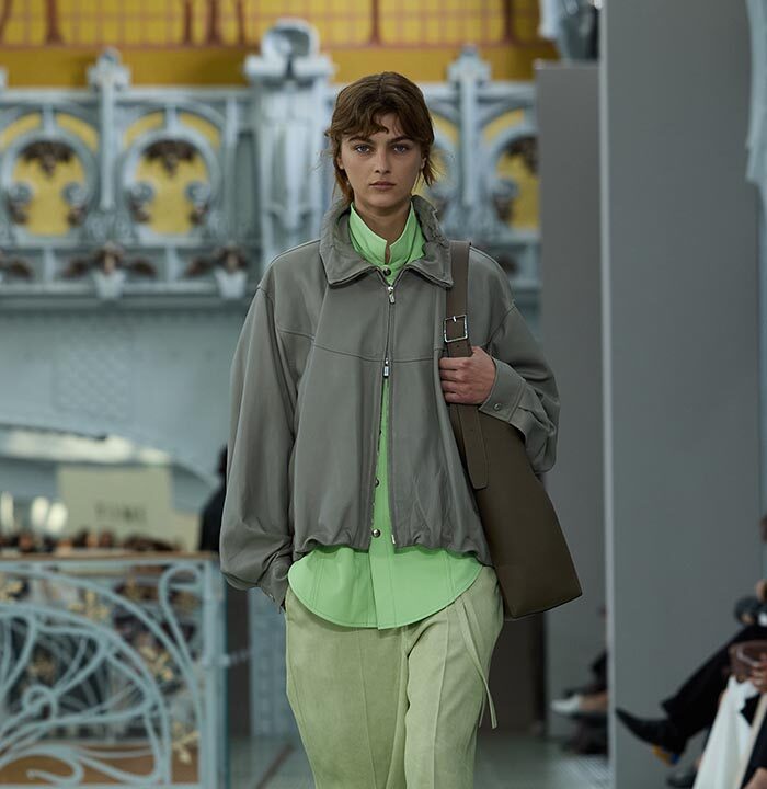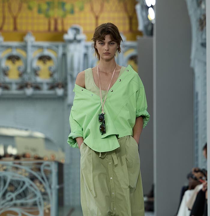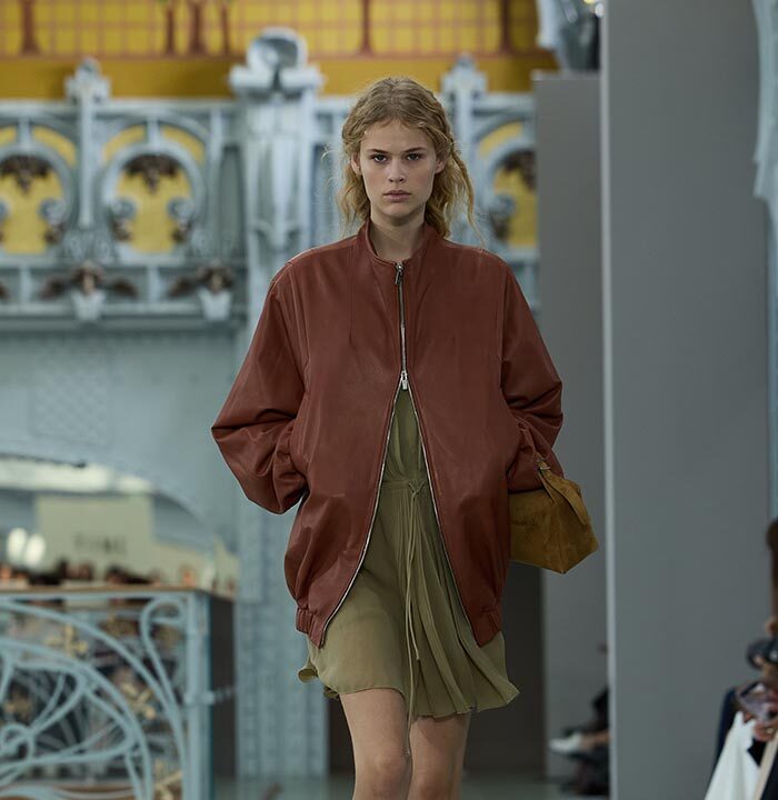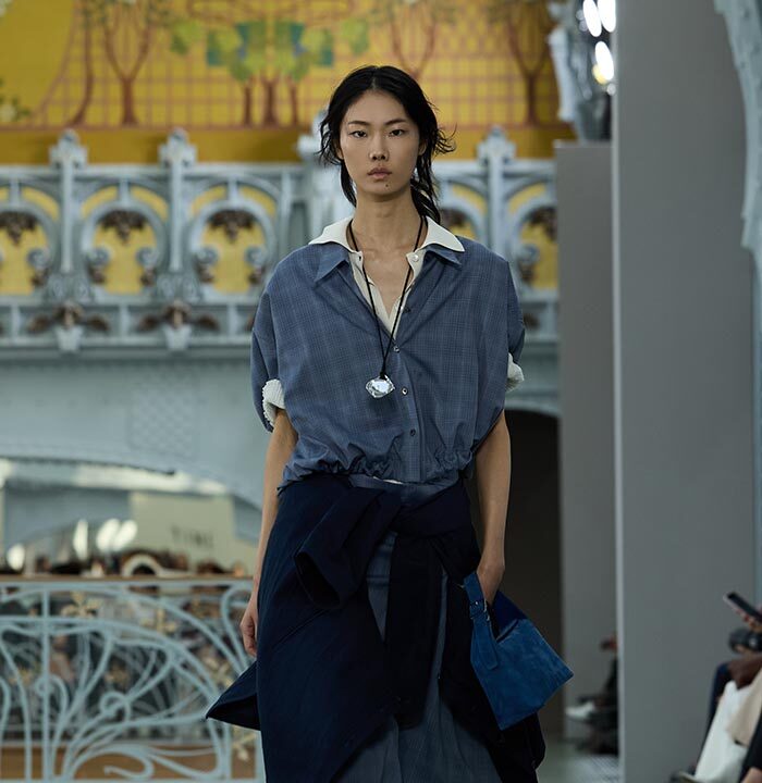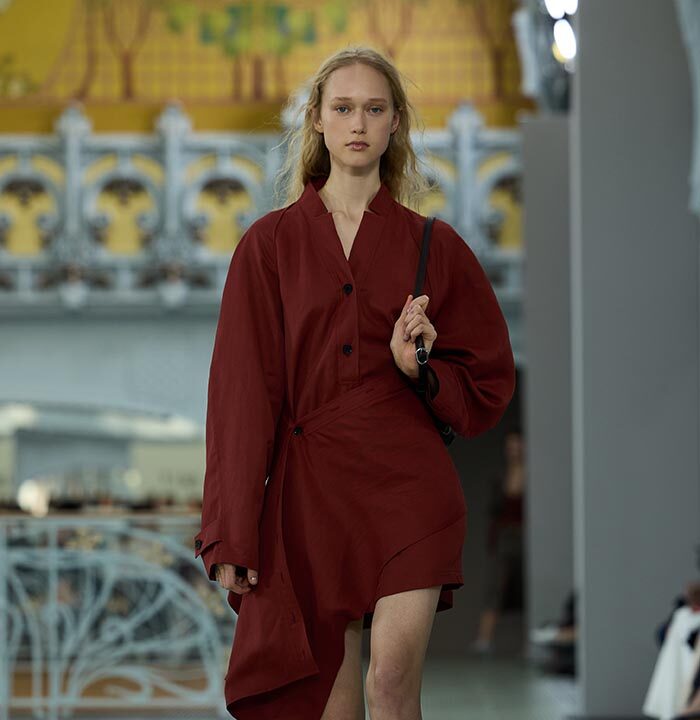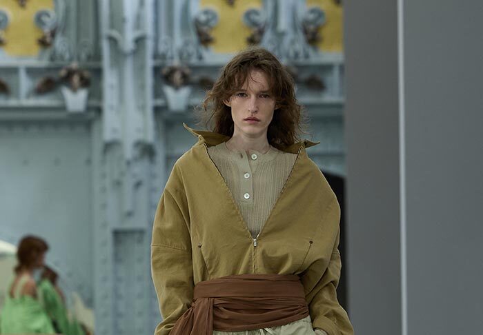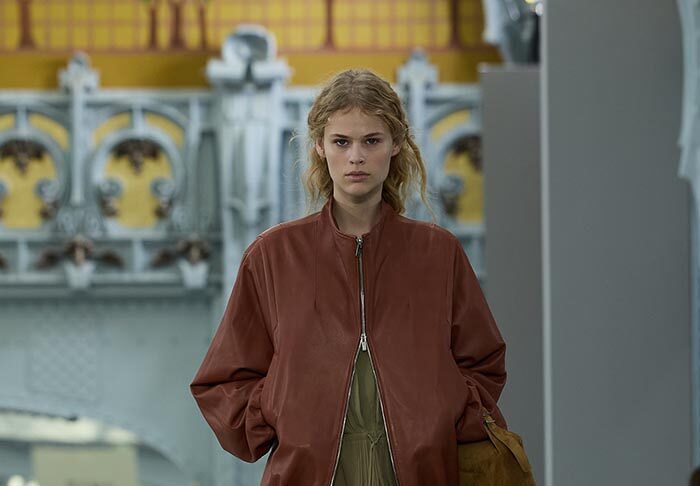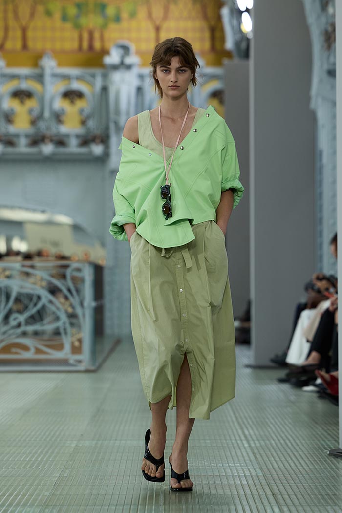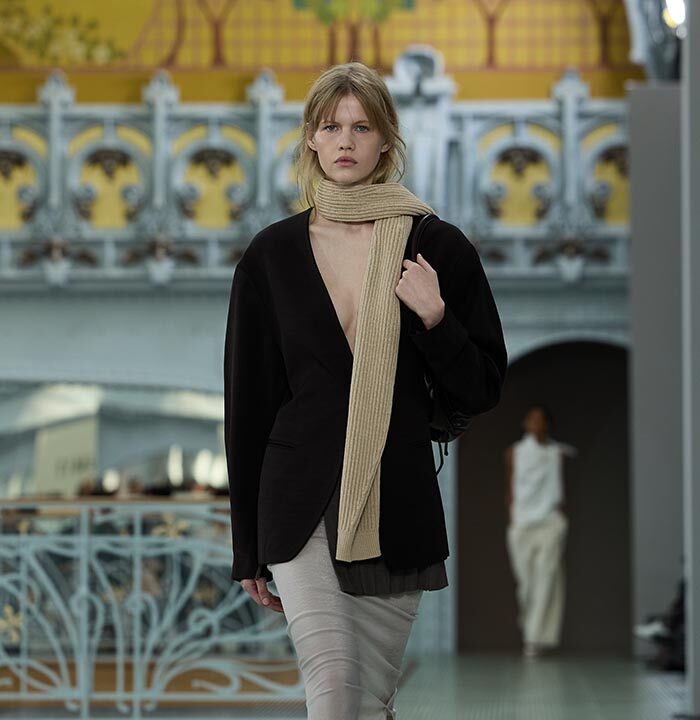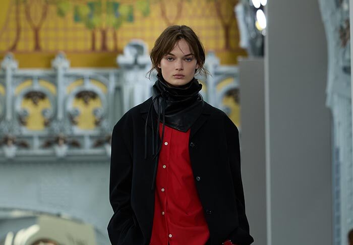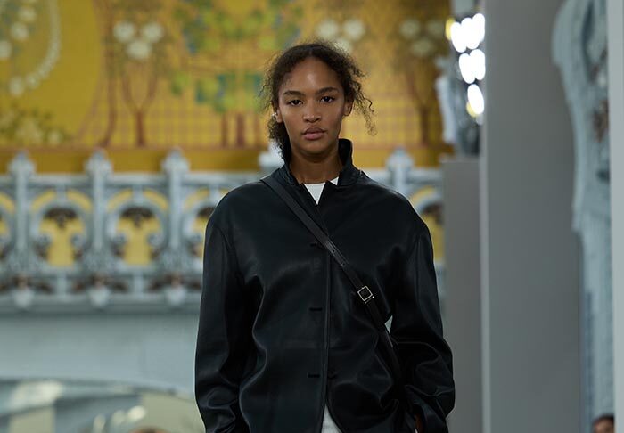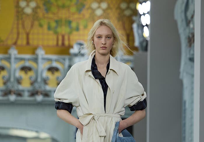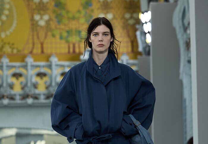 This season, design draws on streetwear, lungewear, and couture to create both harmony and clash,balance and impact. Fluid and supple, the fabrics were chosen to reinforce this play of contrasts while ‘making multiple wearings possible: sft leather, ary silk, washed denim, technical fabric. Likewise, the color palette mixes urban neutrals (light grey, anthracite, off-black, off-white, mustard yellovs) with flashes of cobalt blue, carmine red, faded rose, and lichen green.