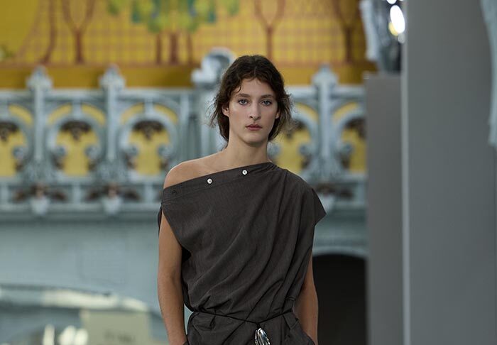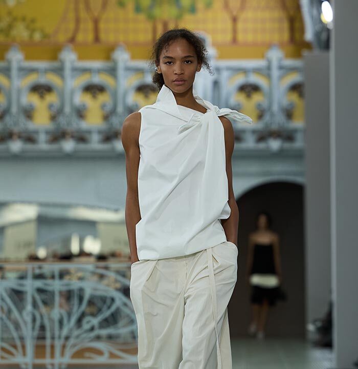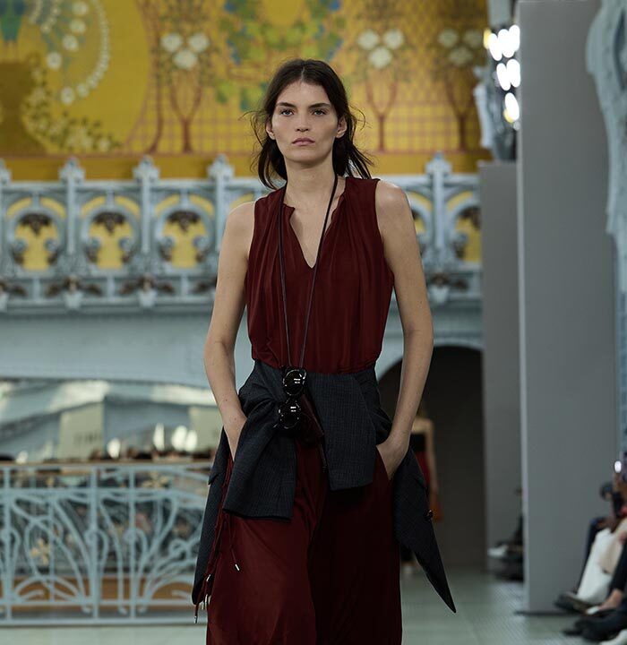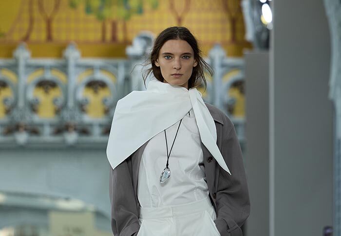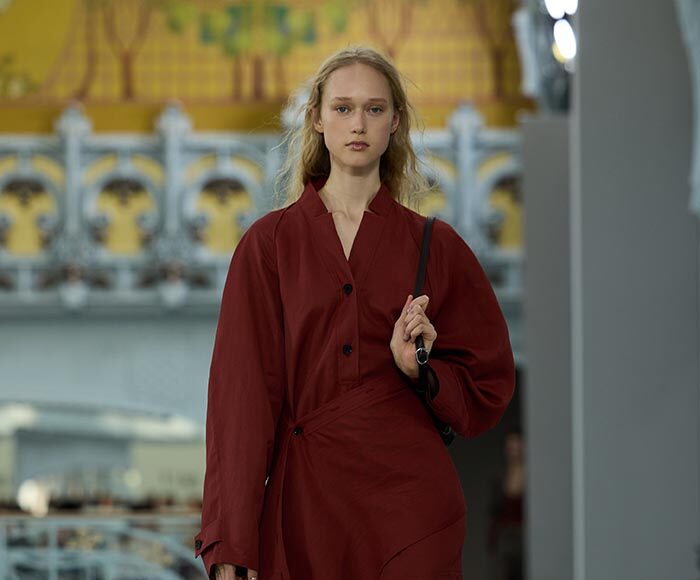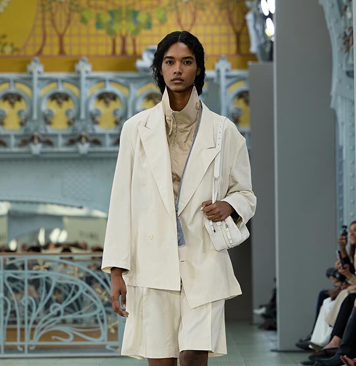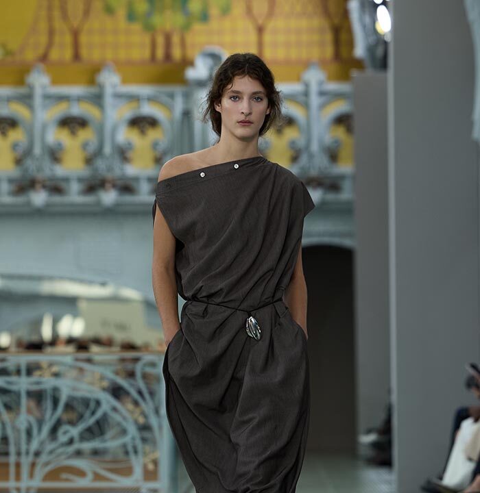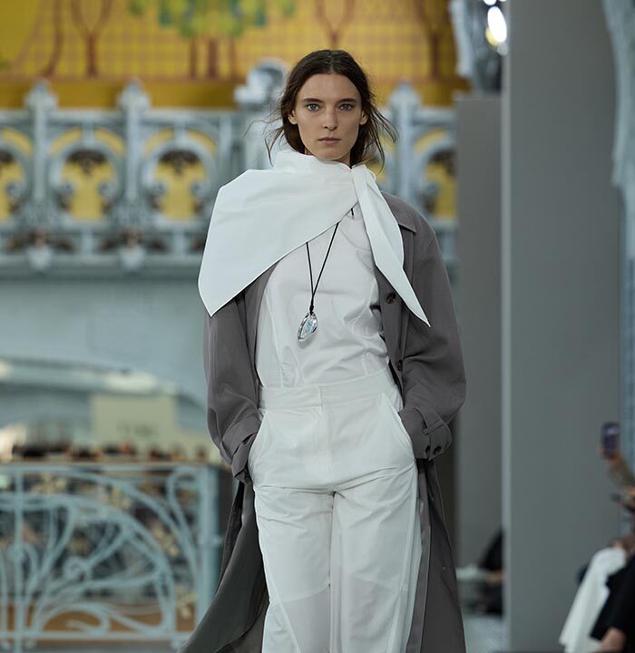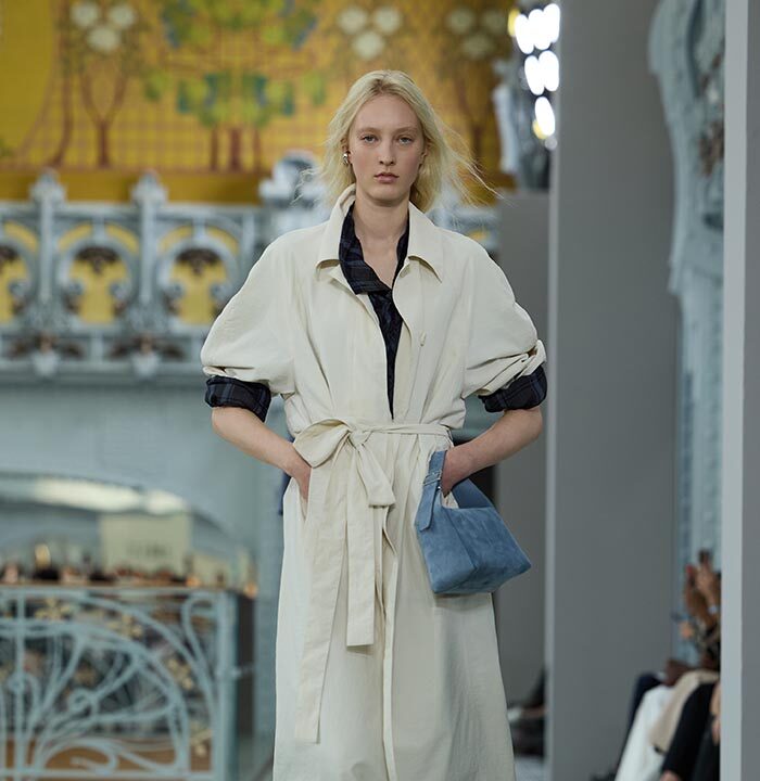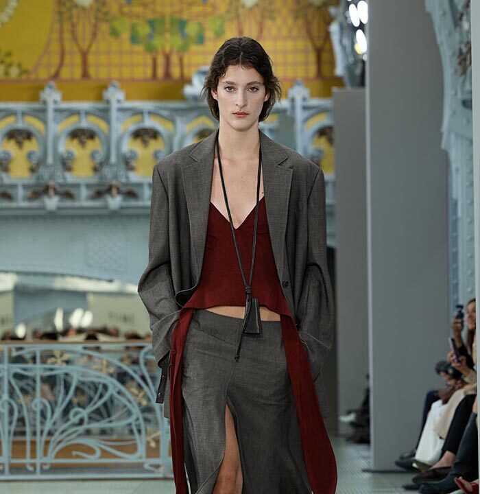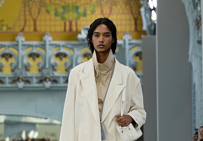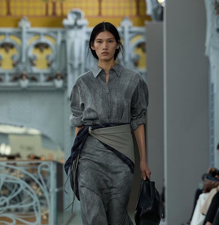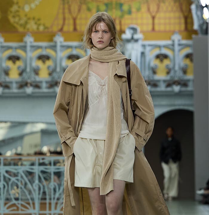 This season, design draws on streetwear, lungewear, and couture to create both harmony and clash,balance and impact. Fluid and supple, the fabrics were chosen to reinforce this play of contrasts while ‘making multiple wearings possible: sft leather, ary silk, washed denim, technical fabric. Likewise, the color palette mixes urban neutrals (light grey, anthracite, off-black, off-white, mustard yellovs) with flashes of cobalt blue, carmine red, faded rose, and lichen green.