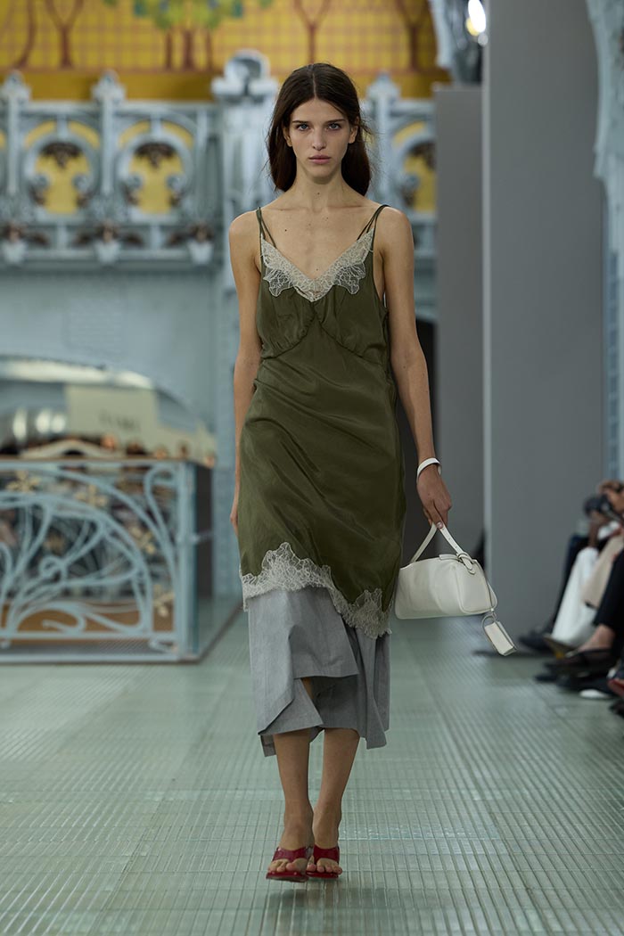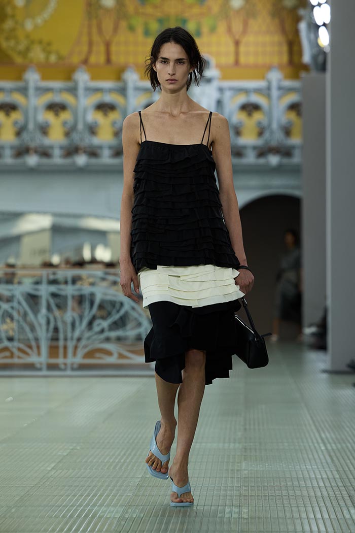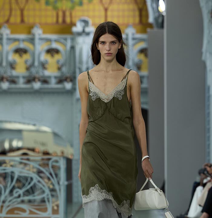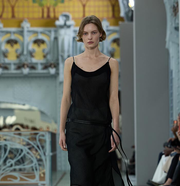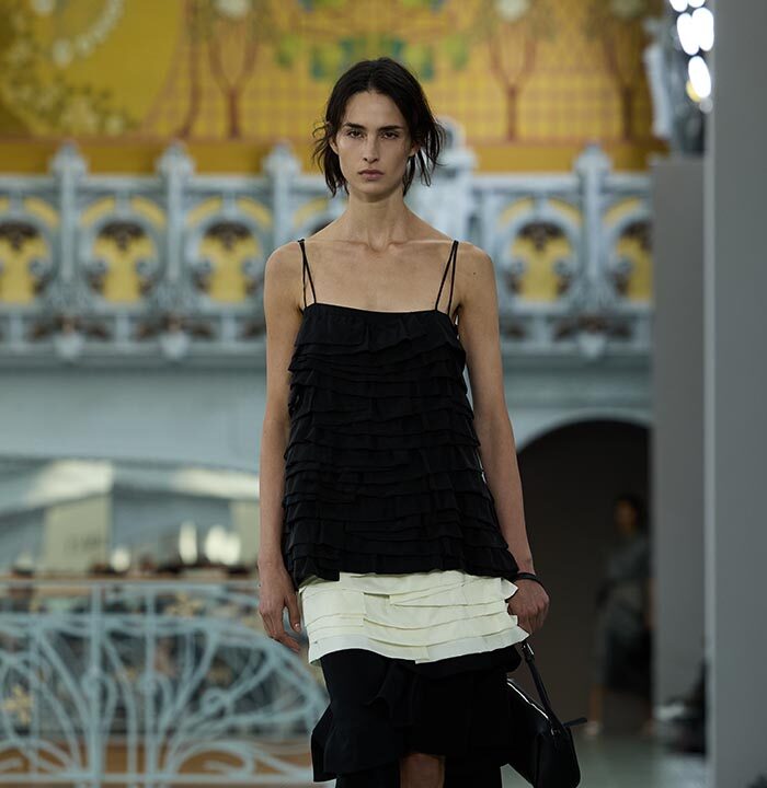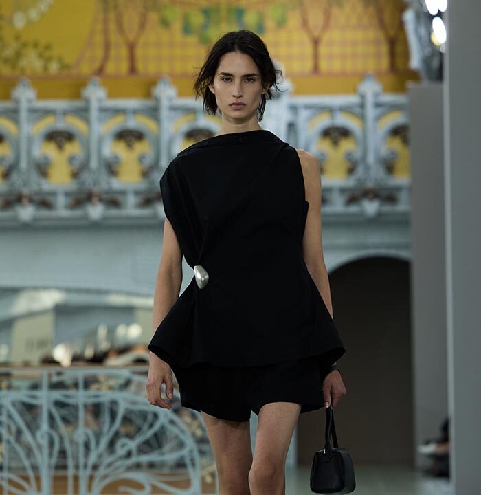Above all, details were conceived to offer endless transformations. Drawstrings, draping, zips, and snap buttons invite play with lengths, volumes, and asymmetries – transforming a short skirt into a long sheath, ora loose, flowing top into a cinched silhouette. Clever cut-outs allow for multiple stylings: a vest or sip can be worn open or closed, front or back, alone or layered, witha strict or sensual attitude. A jacket can become a shirt or a dress. Belts with integrated pockets reshape the silhouette, bringing both practicality and singularity. Everything is layerable, nothing i fixed, in a collection each woman can interpret in her own way, throughout her day.