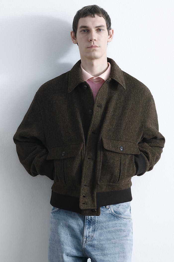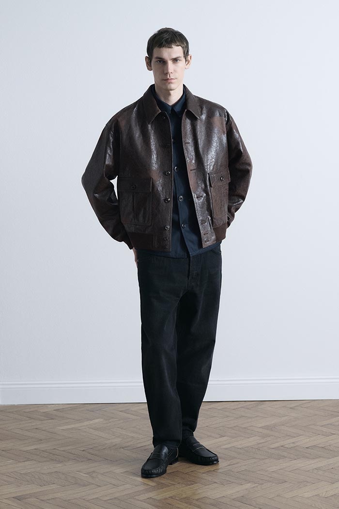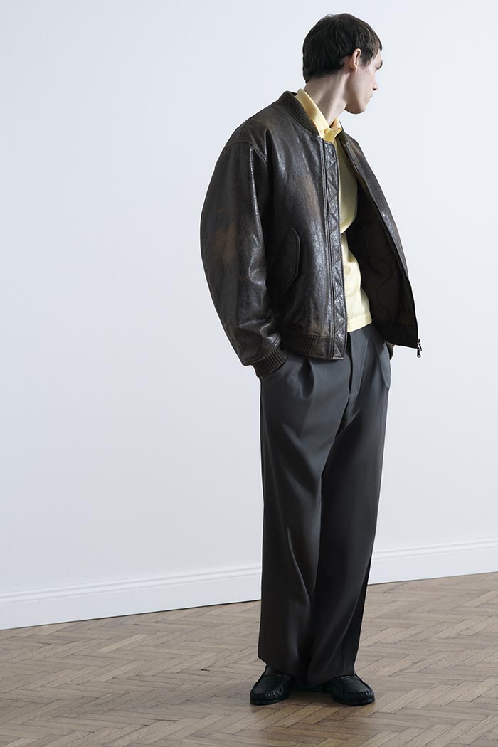 Materials shape the entire collection. Italian and Japanese fabrics selected for their excellence are paired with denser, more traditional British textiles, creating a dialogue of weight, texture, and character. Three- dimensional surfaces, shearling, suede, and artisanal treatments define the season. Among these, cracked leather emerges as a signature of the brand, developed with long-standing partners through non-industrial processes that emphasize its distinctive, handcrafted nature.