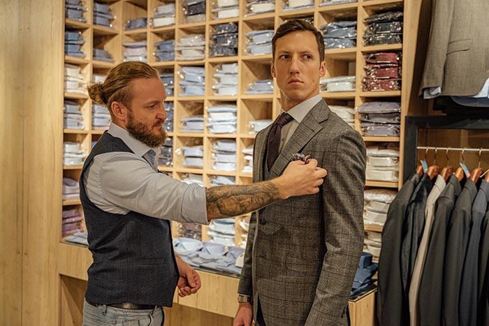 - Decide on style elements such as lapel width, jacket length, button stance, and trouser cut.