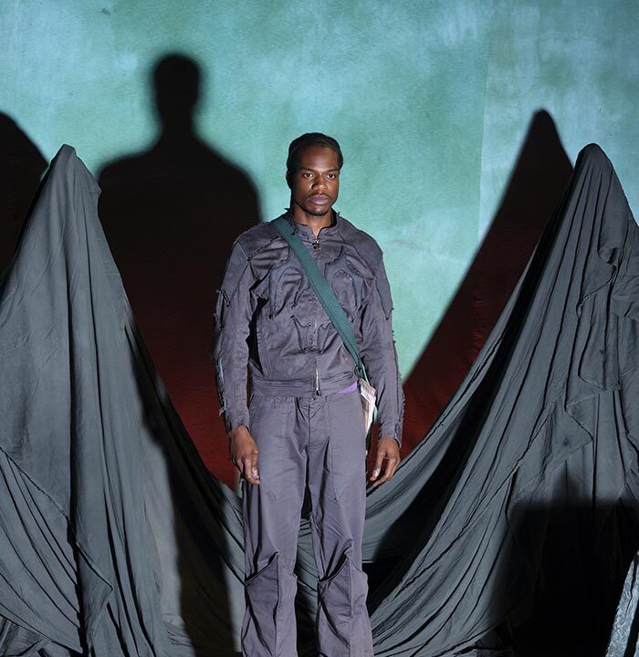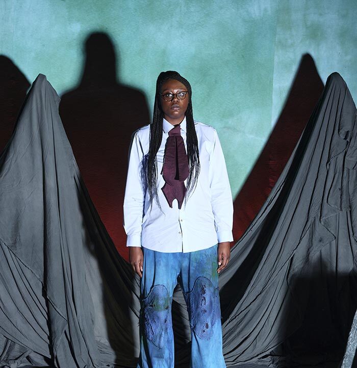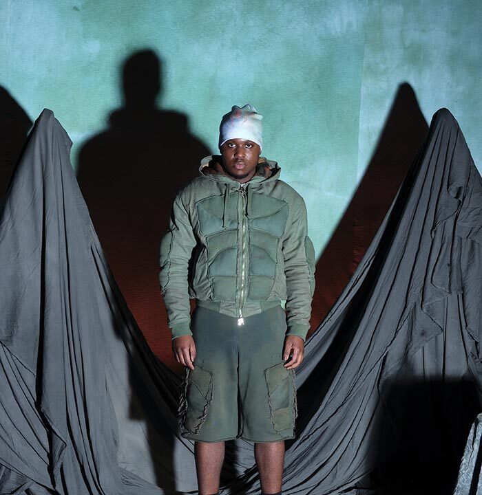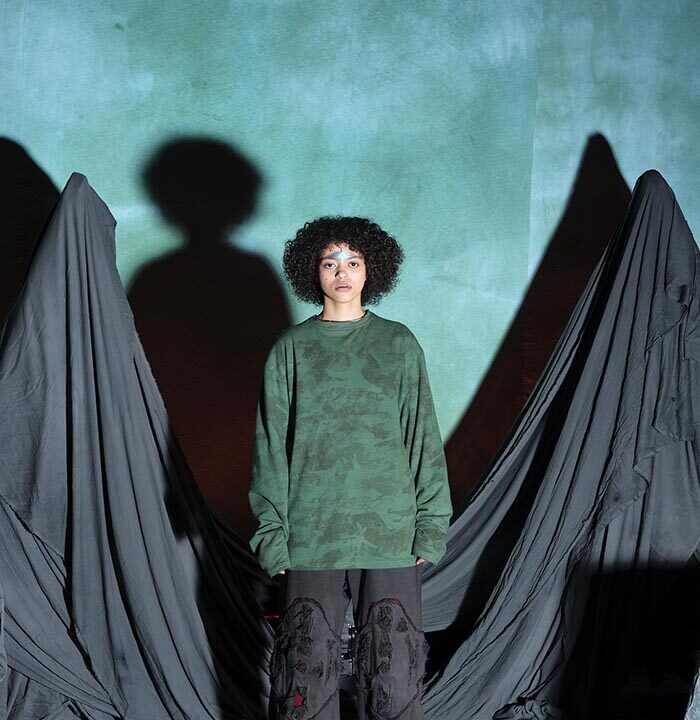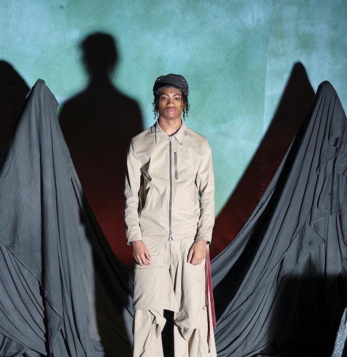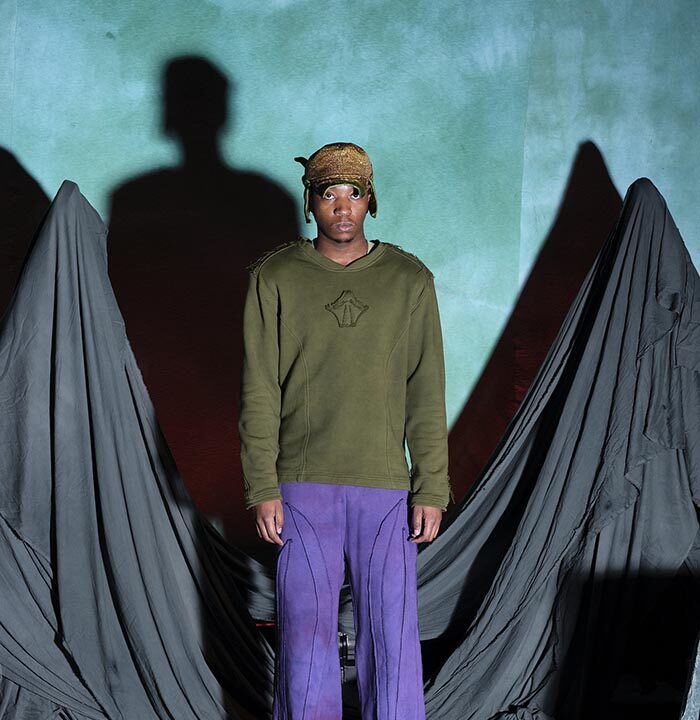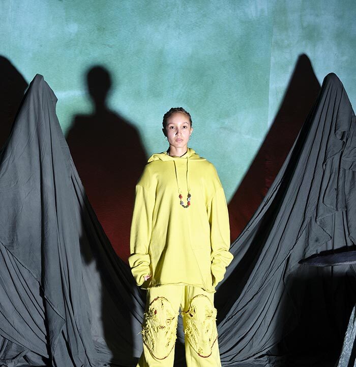 To the British Fashion Council, for providing us with a platform to share our creations. To the Paul Smith Foundation, Projekt, the Mayor of London, and Martha Mosse, for giving us a space to create.To Laura Vaughan and Blonstein Productions, for the on-the-ground support that makes it possible to turn fantasy into reality. To Dermot Daly—we want to be you when we grow up. To our amazing actors, for shining so brightly, each in your own special way. To Michelle Dacillo and Richard Phillipart, for helping our actors feel their most confident selves. To Jordan Fox, for once again building the perfect score for our characters’ journey. To Madison Hahn & Nike London, for your continued support—we wouldn’t want anything but the swoosh on our characters’ feet. To Olya Kuryshchuk, for being a true supporter and always just a phone call away. To Baile Ali, Jordan Core and Oscar Finnie, for capturing the moment. To Vega Textiles, for always coming through with the perfect canvas for us to create on, and to Beker Studio, for providing a place where we could bring that canvas to life. To Beata Kubala & Lucy, Ibrahim & Guney Guvec, and Abdul Malik, for helping us transfer our work from the studio into the hands of the people.