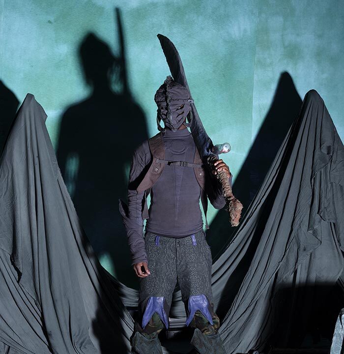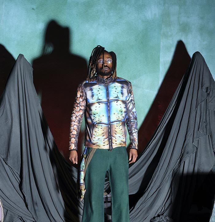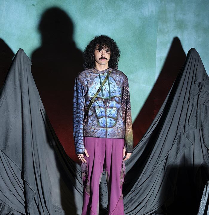 Mum, Ricky, and Lorrelle have spent their time in a forest-like Gathering biome, deeply attuned to nature. Lorrelle, my eldest sister, is the Protector, anxiously guarding the children and managing the group’s camouflage. Her husband Ricky, the Provider, hunts and fishes in animal pelts, passing down his skills to my niece, Beau. Mum, a real-life shapeshifter, takes on the most fantastical form — morphing between a beetlelike exoskeleton, reptilian scales, and fur as necessary support the group. The rest of the family has also transformed. Grandad became the Mischievous Tinkerer, Karis the Mediator, Stephanie the Animal Whisperer, Amir the Attacker, Nathaniel the Defender. Dad split into two — Old Dad, weathered and gaunt, and New Dad, freshly synthesised and muscular. These identities are woven into every aspect of the collection — from textiles and prints to dyeing techniques and pattern cutting. These archetypes are more than just a narrative thread; they shape the very fabric of the design.