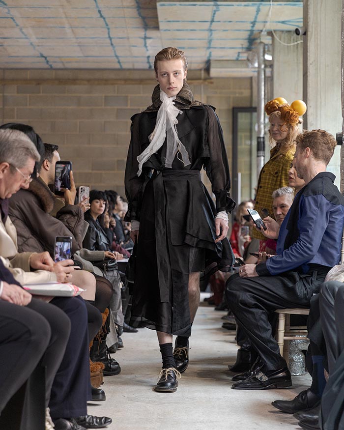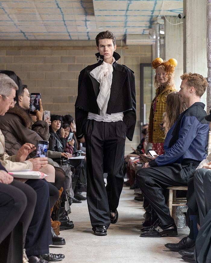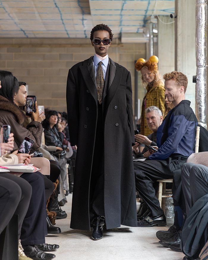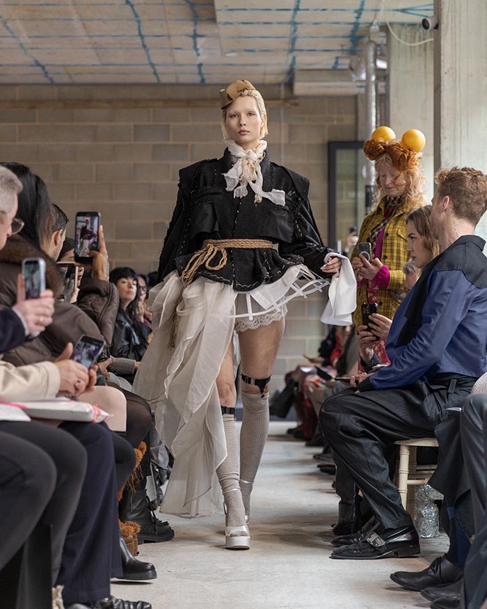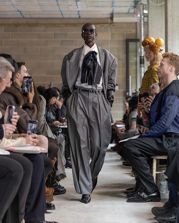 The presentation begins outside, with models walking slowly from the street into the gallery, not as a grand entrance, but as a return from weather, as if stepping back into a private interior world. Inside, an installation by Tony Hornecker anchors the space: a broken, time-worn dinner table that still holds traces of ceremony, a reminder that rituals deserve to continue even when no one is waiting.