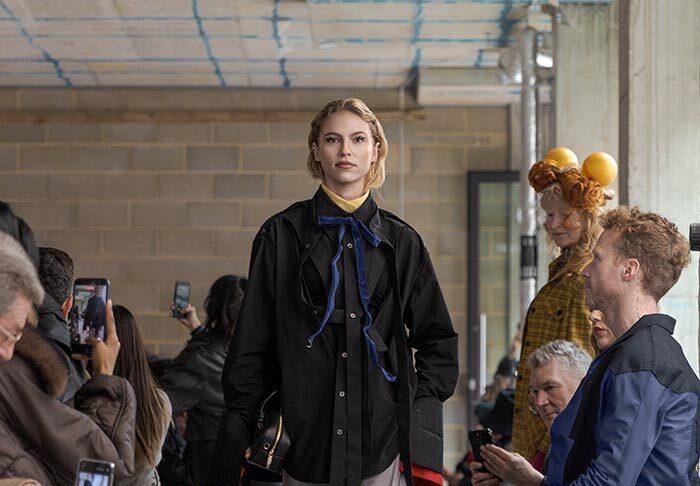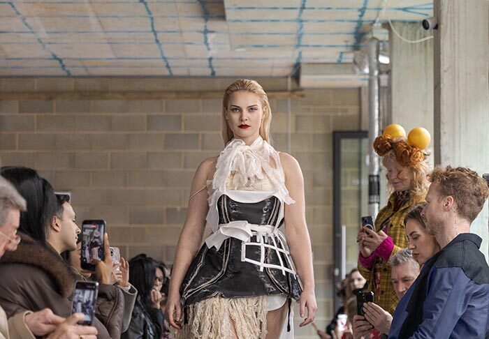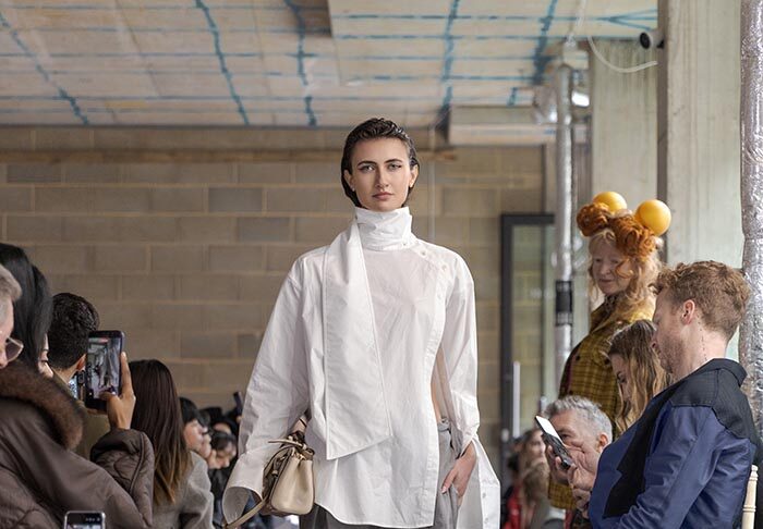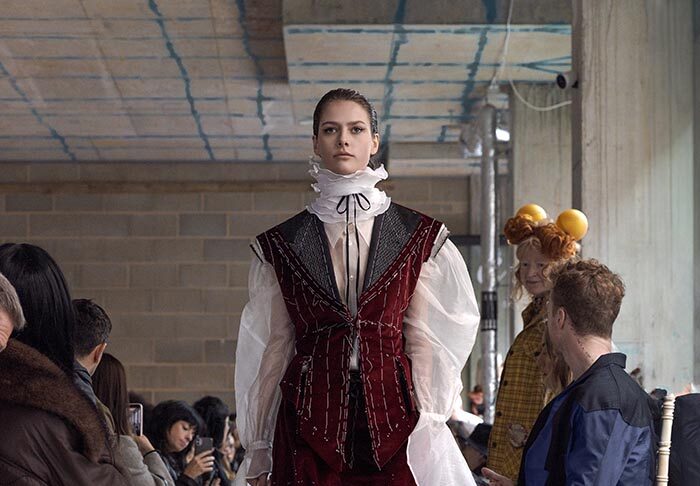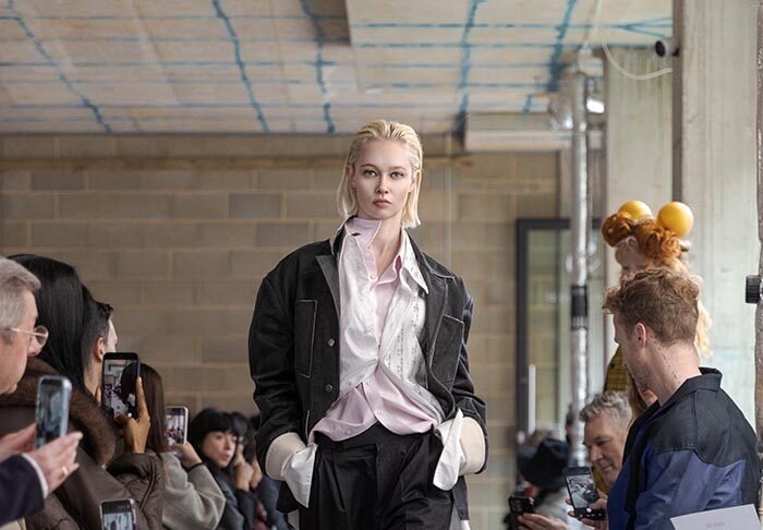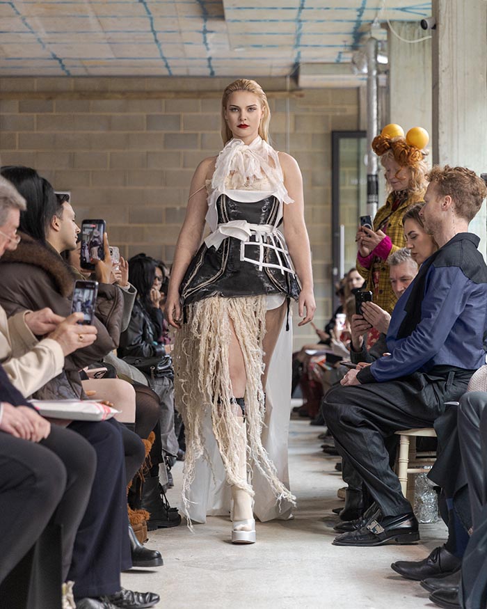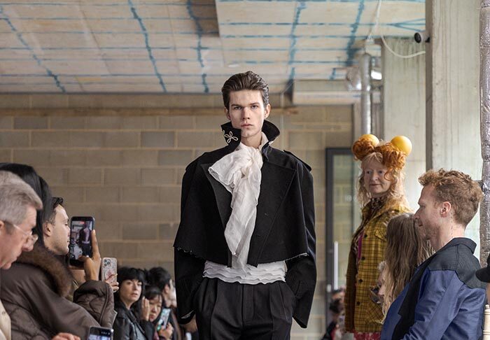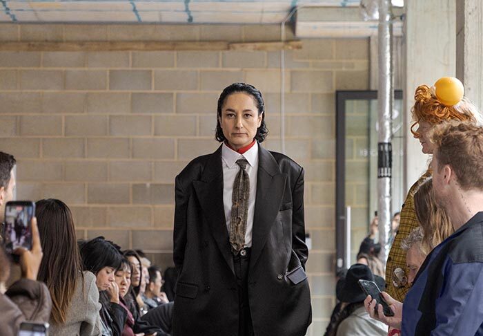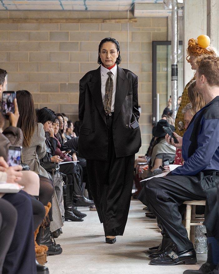 The presentation begins outside, with models walking slowly from the street into the gallery, not as a grand entrance, but as a return from weather, as if stepping back into a private interior world. Inside, an installation by Tony Hornecker anchors the space: a broken, time-worn dinner table that still holds traces of ceremony, a reminder that rituals deserve to continue even when no one is waiting.