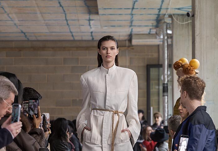 Linen stands at the heart of the material narrative. developed in the designer’s hometown, the hemp fibres carry a dry softness, a texture that feels touched by hand rather than produced by machine. Structured tailoring meets the irregularity of handcraft, giving the garments both a frame and a quiet, human irregularity.