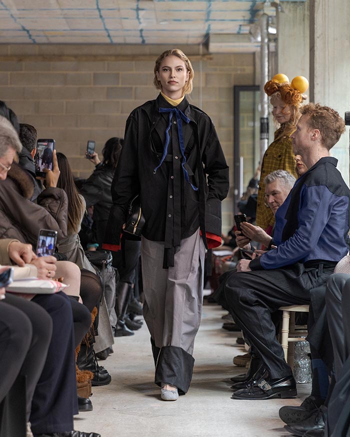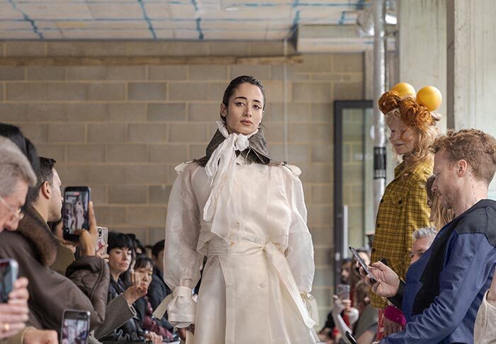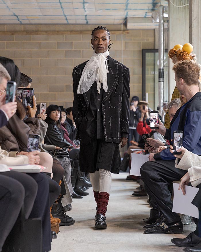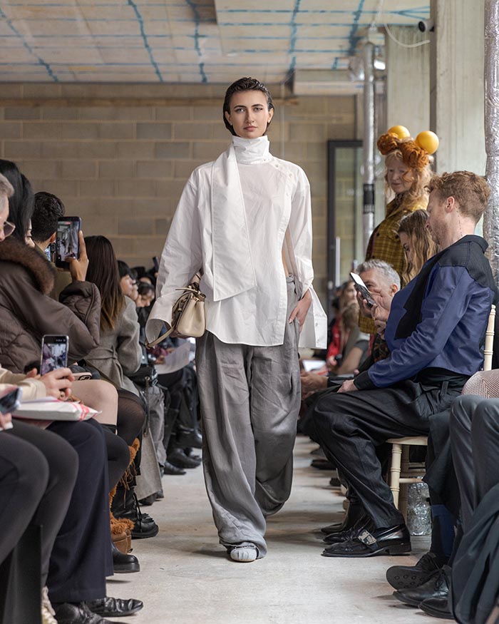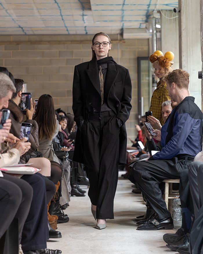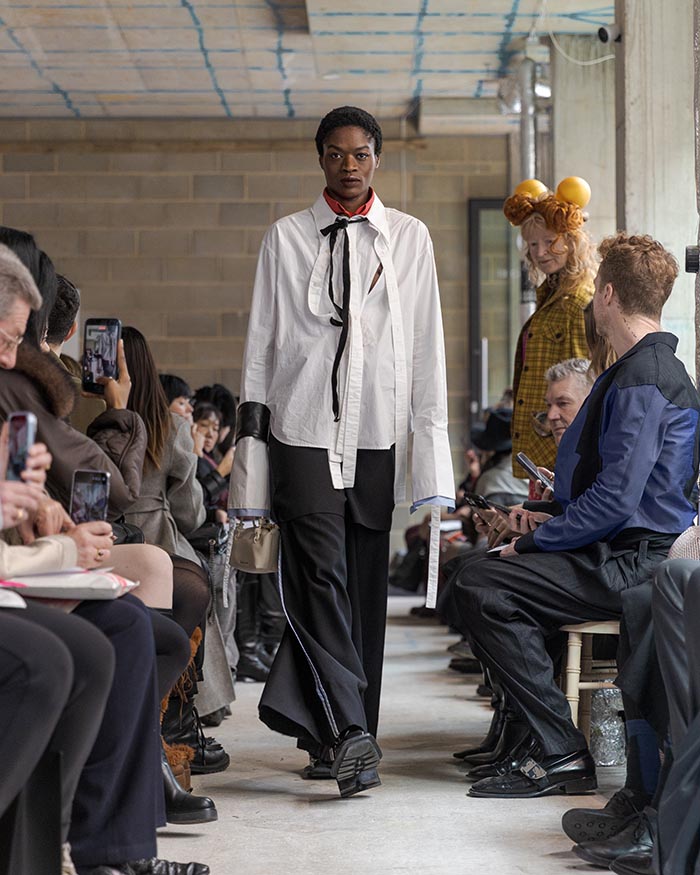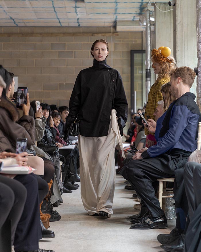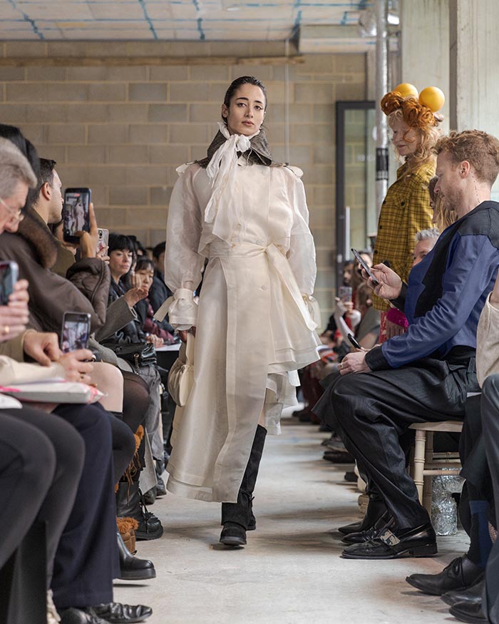 This season is not concerned with perfection. It seeks an elegance shaped by restraint and resilience. Garments are built through wrapping, folding, and soft suspension, techniques that allow fabric to sit close to the body in layered, almost architectural forms. Hand-stitched seams remain visible, tracing the pace of making, where labor turns into ritual, and ritual settles into memory. Classic tailoring is taken apart and reassembled into new anatomies, suggesting a body that recalls both work and tenderness.