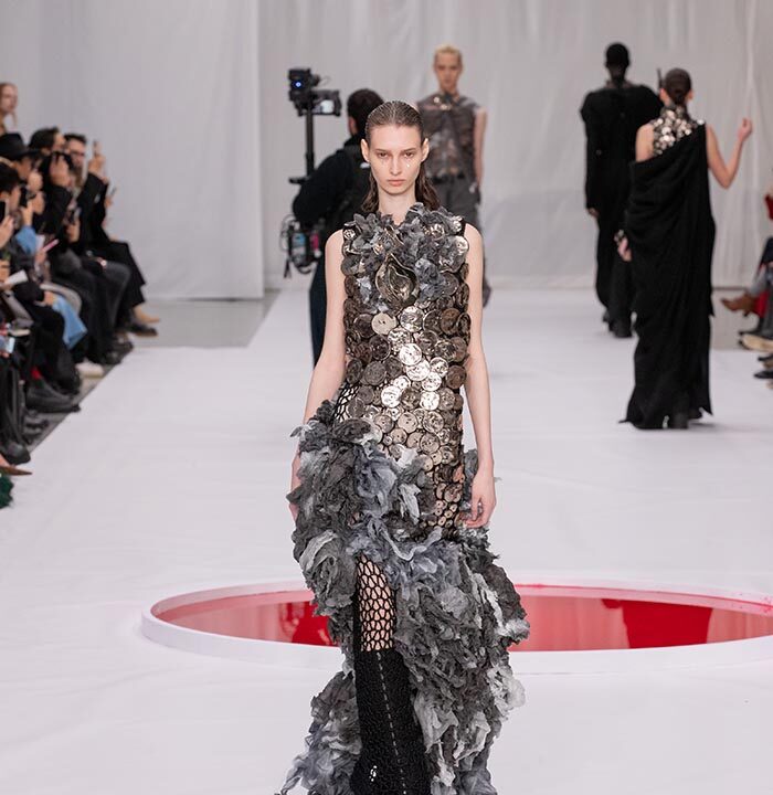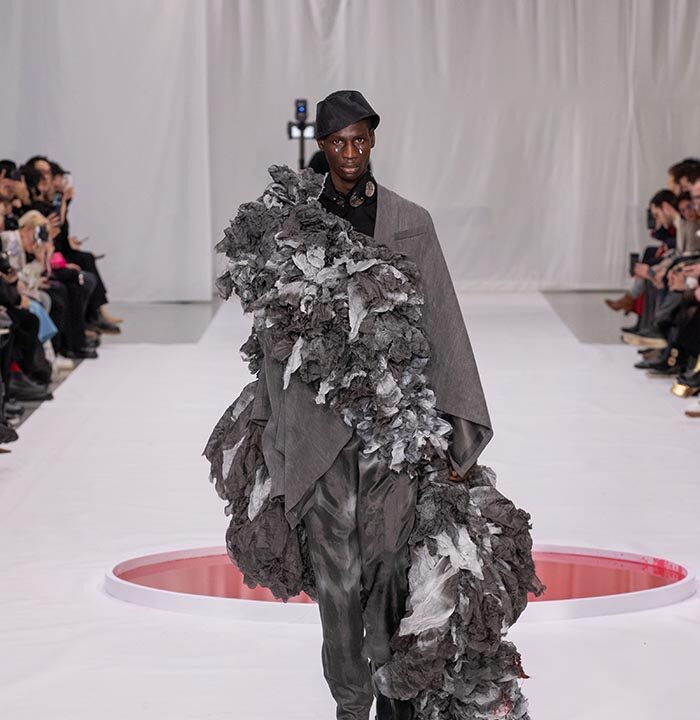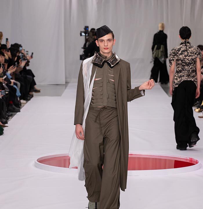 Through the contradictory existence of delicate, fragile armor created by textiles shredded and reclaimed from worn-out uniforms and workwear and decorated with ceramics, glass, and platinum, this collection shows the evolution of clothing that could have been otherwise. It is also an attempt to fuse the delicate and fragile handwork elements of couture with the evolutionary path followed by men’s clothing that has continued since ancient times. The fact that men appear on the stage of haute couture wearing these garments serves to embody our present era through its reexamination of the concept of toxic masculinity.