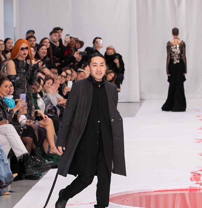In the process of creating this collection, I came across the Japanese word utakata, which means “ephemeral”. This word seemed to express the exact opposite of the trend seen in the evolution of men’s clothing, where functionality and durability are increasingly valued and prioritized. What I wanted to convey with this collection was a sort of ephemeral armor—much like a delicate bubble formed on the surface of the water, capable of vanishing in the blink of an eye. This approach also represents a release from or renunciation of battle.