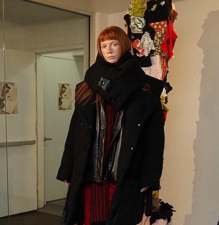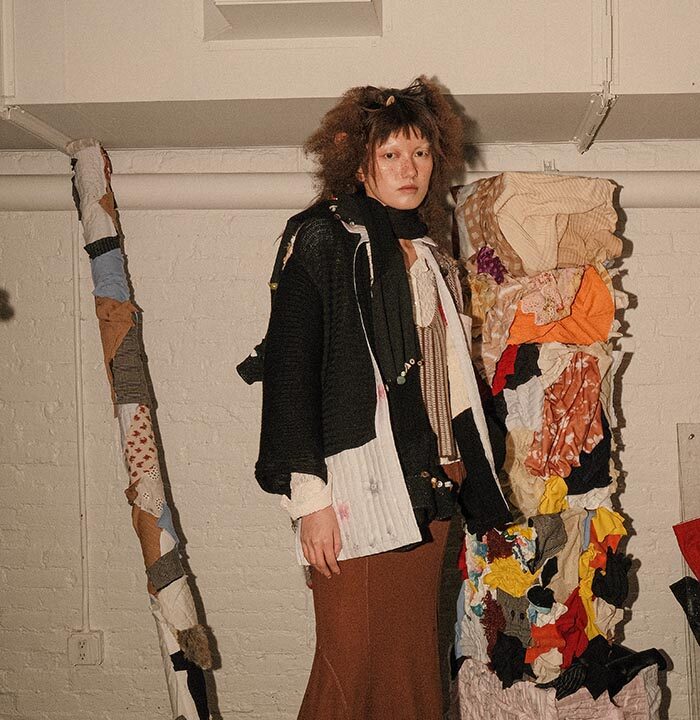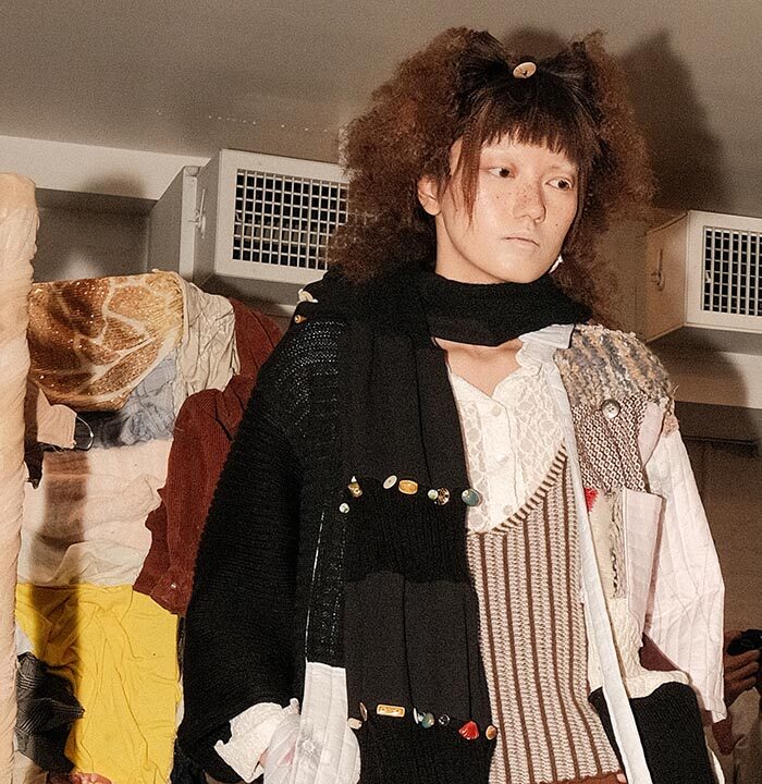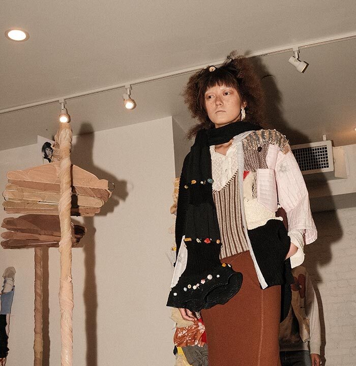 The presentation will include a backroom decorated with deadstock materials, fabric scraps and multiple installations to symbolize a “hoarder’s room” behind the main stage. An elderly Asian model will sit amidst those installations and crochet small gifts for guests. This will help depict the real environment of a hoarder’s daily life.