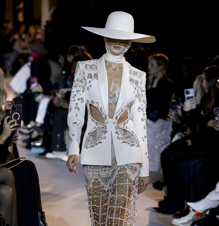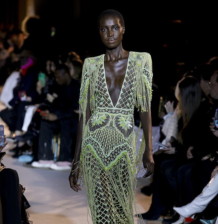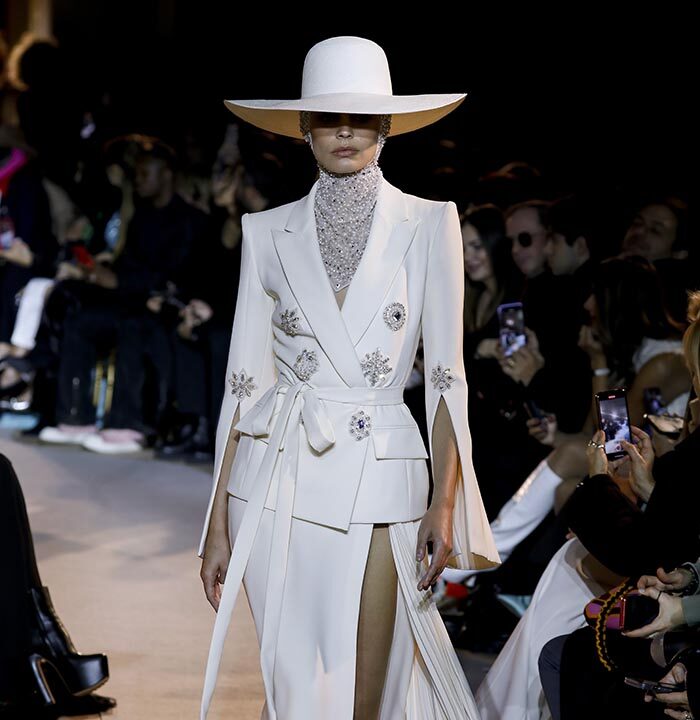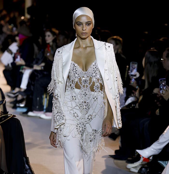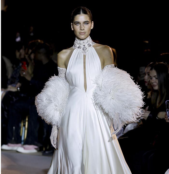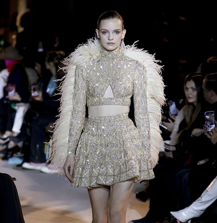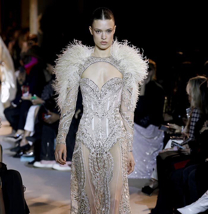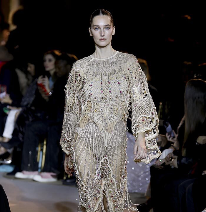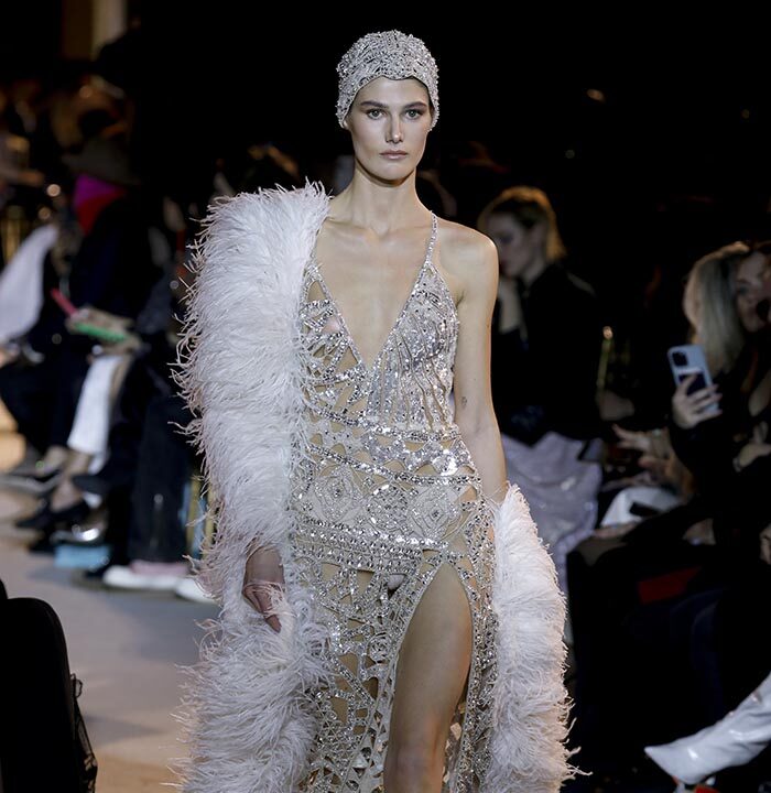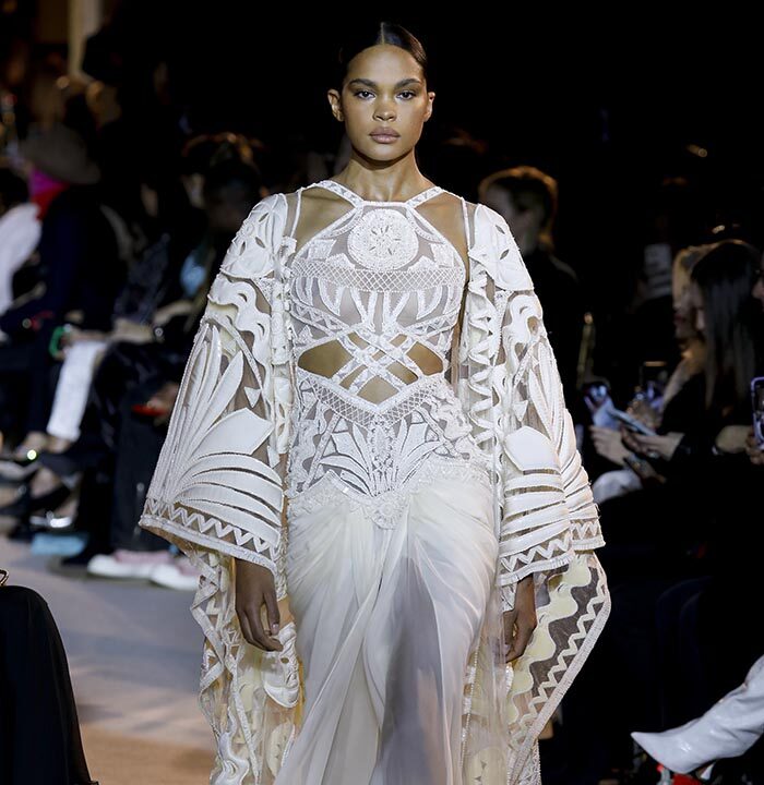 The spirit of the Roaring Twenties is back, among fringes, gathered waists, integrated veils, head ornaments or streams of crystals, evoking the gaiety of an era that followed the unimaginable tension of the First World War. The same 1920s that influenced fashion in the 1970s are back in Zuhair Murad’s 2023 Spring Summer Couture Collection, combined with small touches featuring bell or batwing sleeves and fluid, pajama-like trouser sets with precious macramé embroidery. Above all, the collection reflects a longing to resume life as it was before the Covid-19 pandemic and other crises while keeping only the essentials.