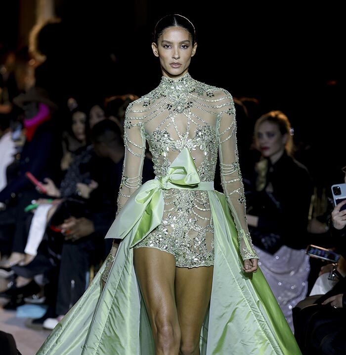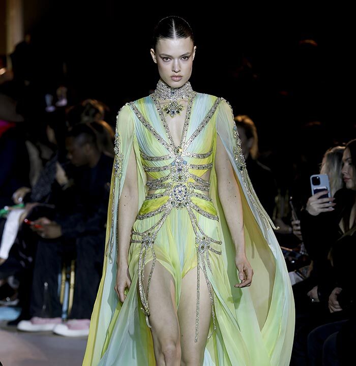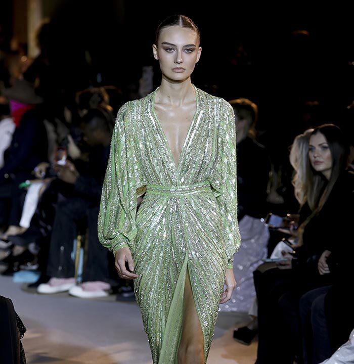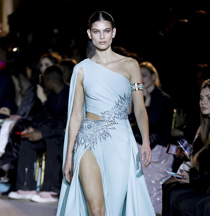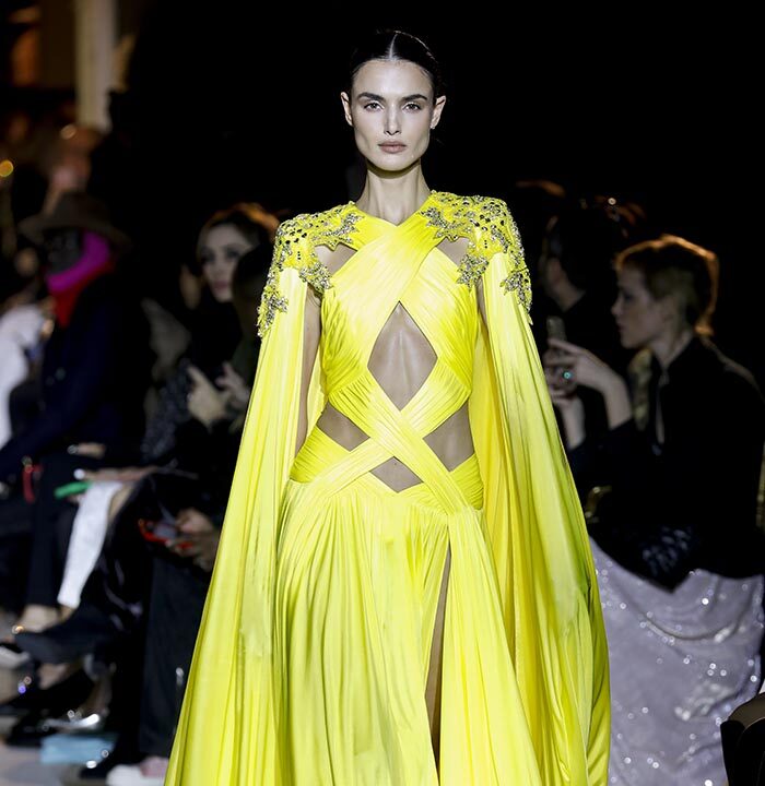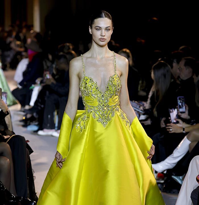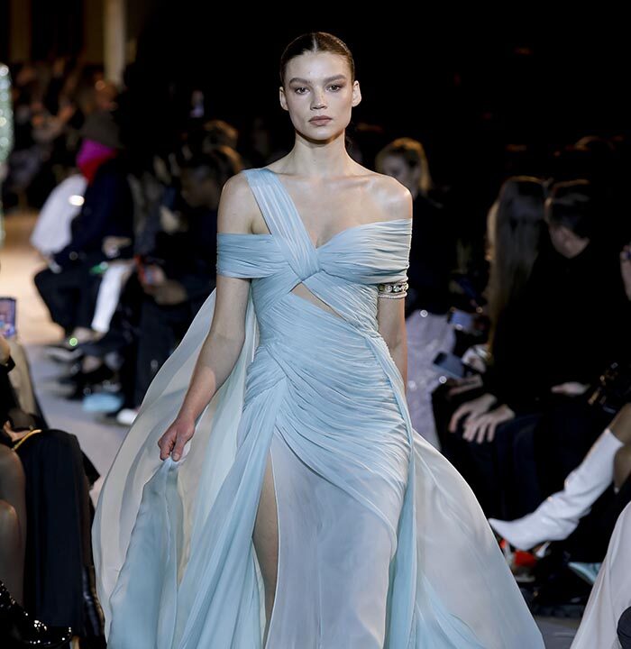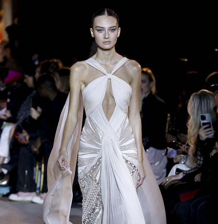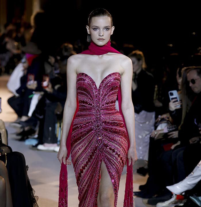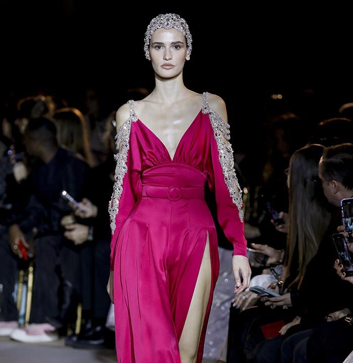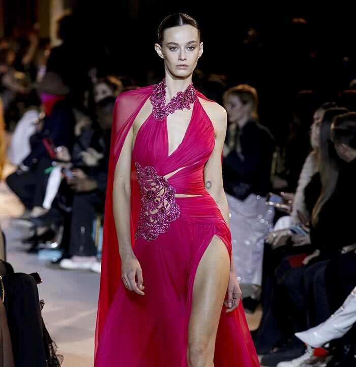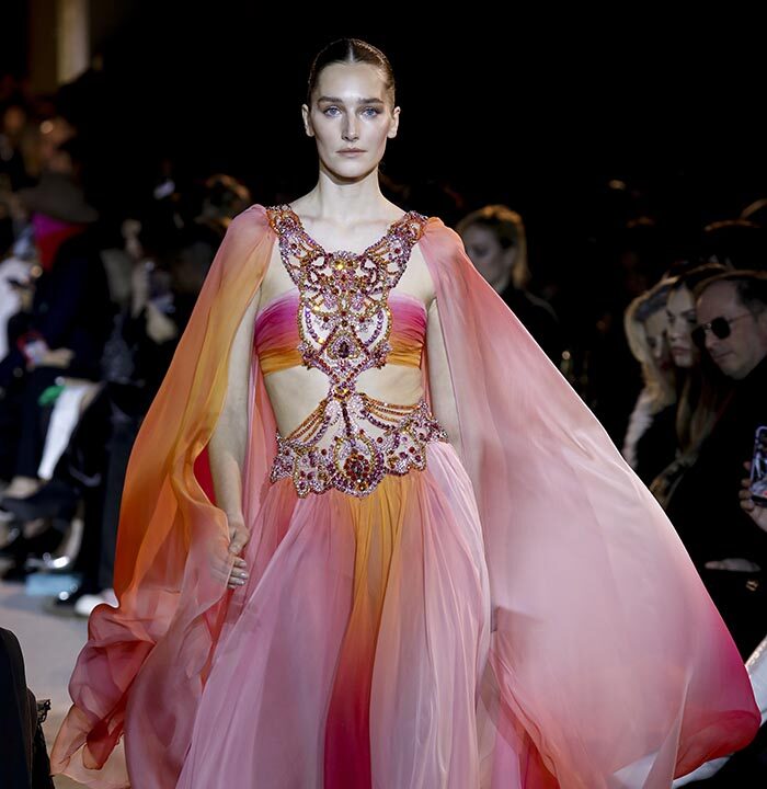 The embroidery patterns in the collection are inspired by architectural details from the Belle Époque. Silk whispers in caddy, tulle, chiffon, taffeta, satin, jersey or chiffon. The palette, often shaded, marries the fires of the setting sun on the sea. Soft pink, bright pink, flame orange, pale green, Caribbean blue, fading yellow, where drapery and precious embroidery dominate. Jewels handed down through generations, priceless stones, and Hollywood brooches come out of the coffers, underlining the suppleness of a sheath, the modeling of a bust.