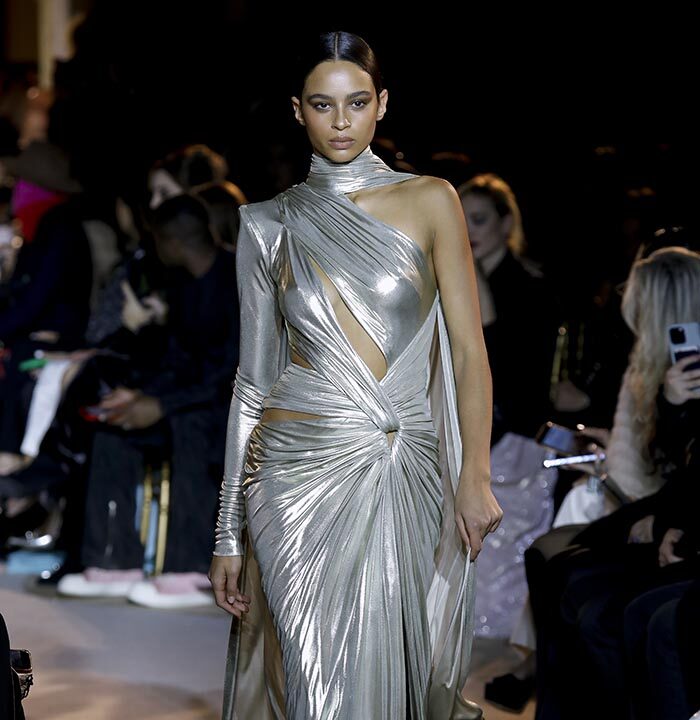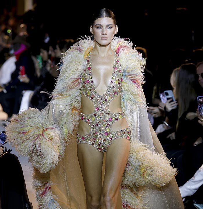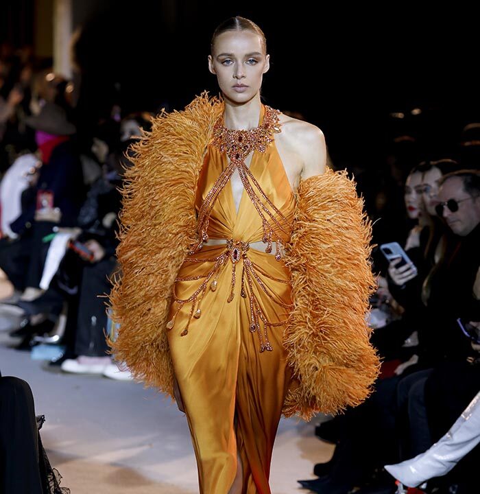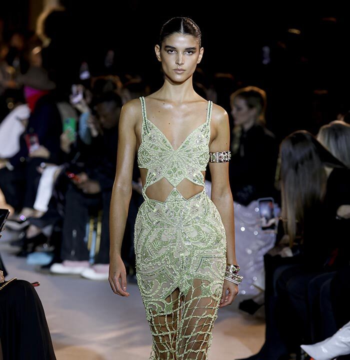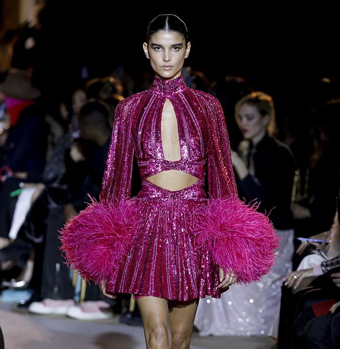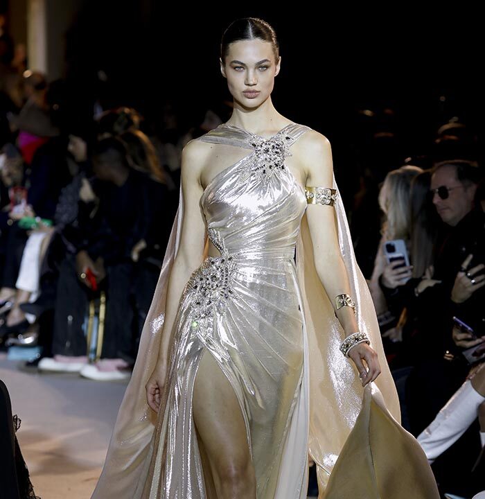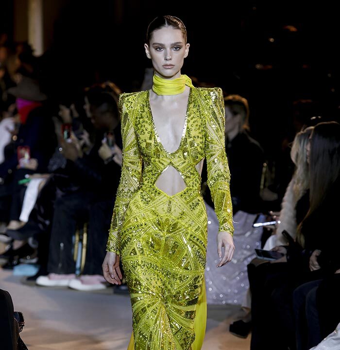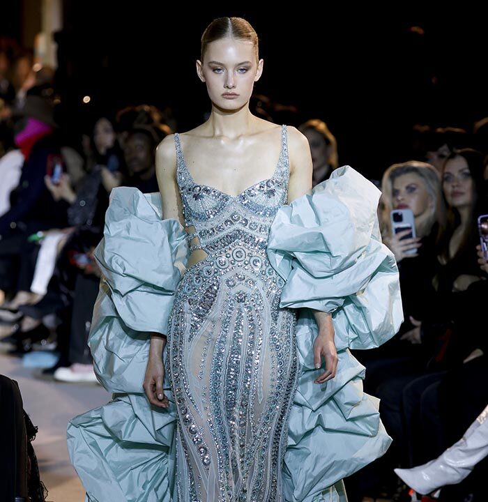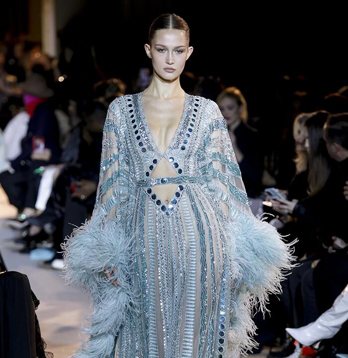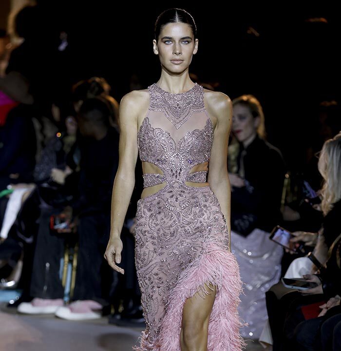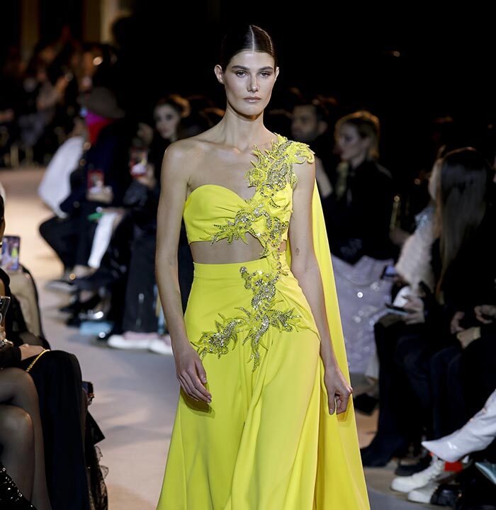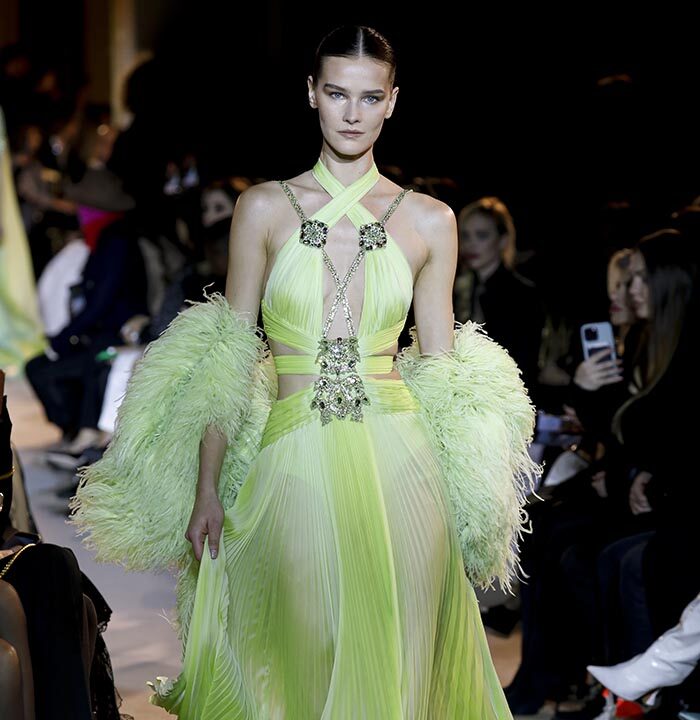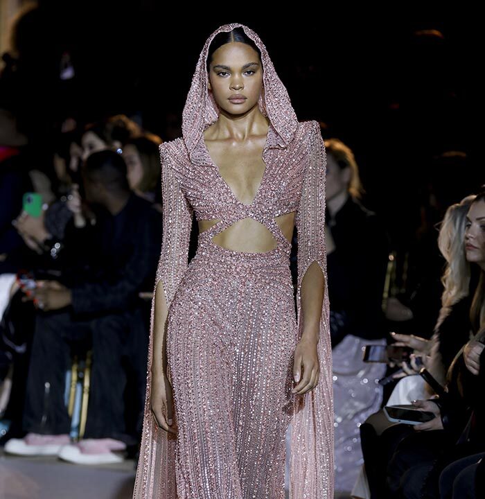 The embroidery patterns in the collection are inspired by architectural details from the Belle Époque. Silk whispers in caddy, tulle, chiffon, taffeta, satin, jersey or chiffon. The palette, often shaded, marries the fires of the setting sun on the sea. Soft pink, bright pink, flame orange, pale green, Caribbean blue, fading yellow, where drapery and precious embroidery dominate. Jewels handed down through generations, priceless stones, and Hollywood brooches come out of the coffers, underlining the suppleness of a sheath, the modeling of a bust.